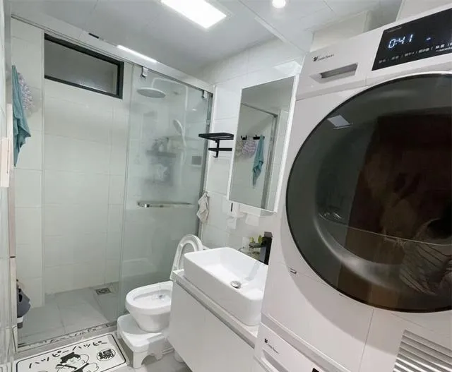 最让我惊讶的是卫生间!别看户型小,人家硬是塞进了洗衣机加烘干机的组合,还做了干湿分离!洗手台、马桶、淋浴隔断,该有的功能一样不少.