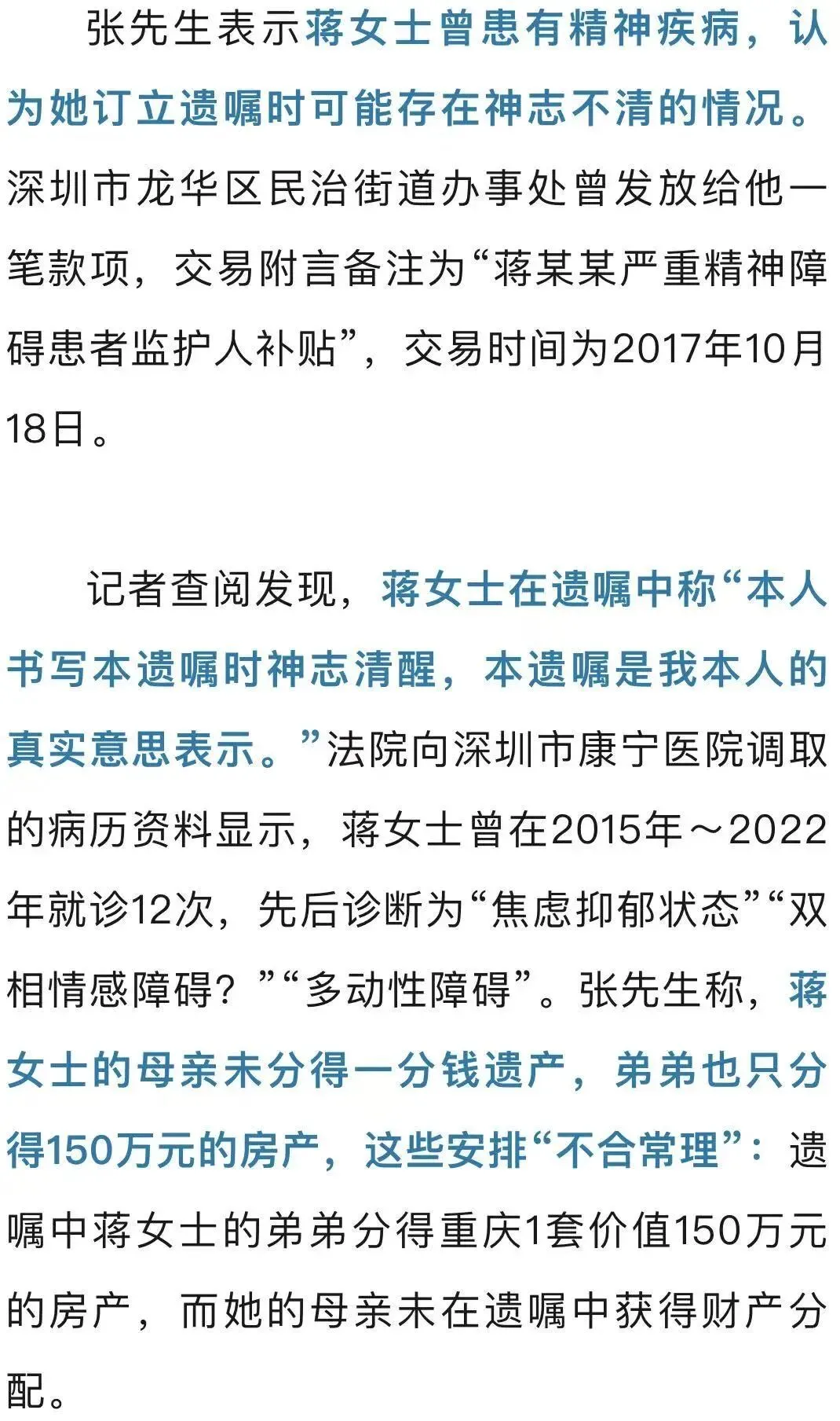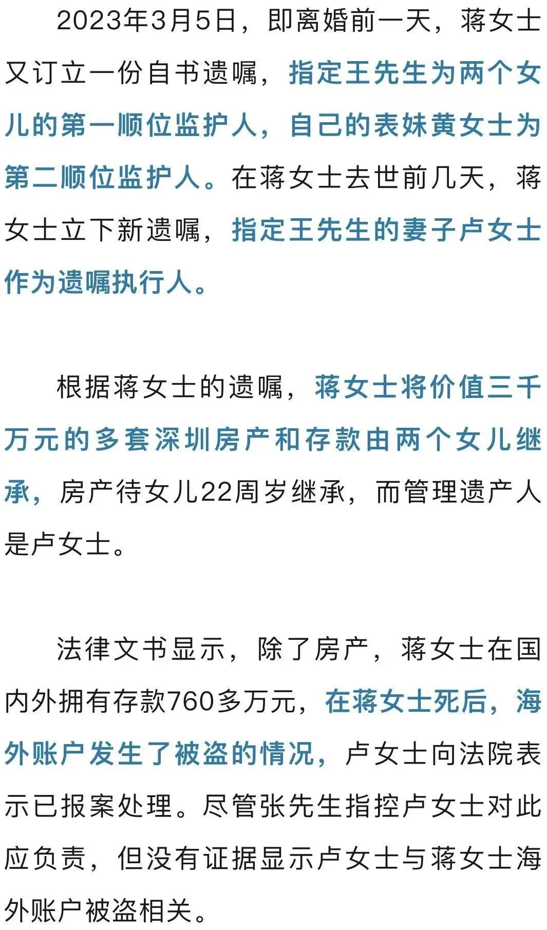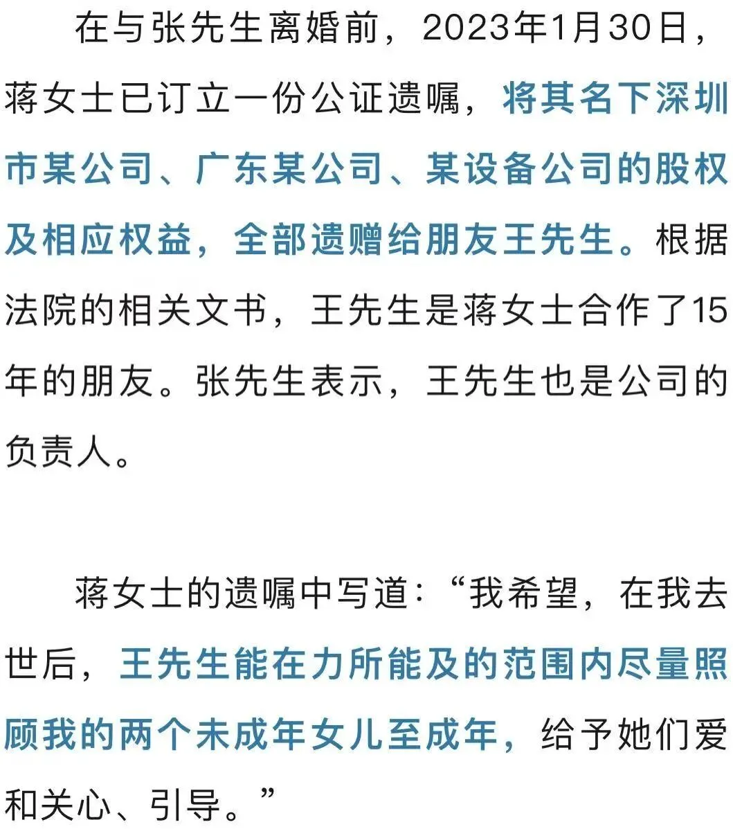 根据离婚协议,两个女儿均由蒋女士直接抚养,张先生无需支付抚养费。财产分割方面,蒋女士名下深圳市3套房产、惠州市1套房产归张先生所有,蒋女士还向张先生支付补偿款共计230万元。张先生表示,按照当时房产估计,他分得的财产价值1000多万元。蒋女士去世后,张先生先后获得3套深圳房产和15万元现金。