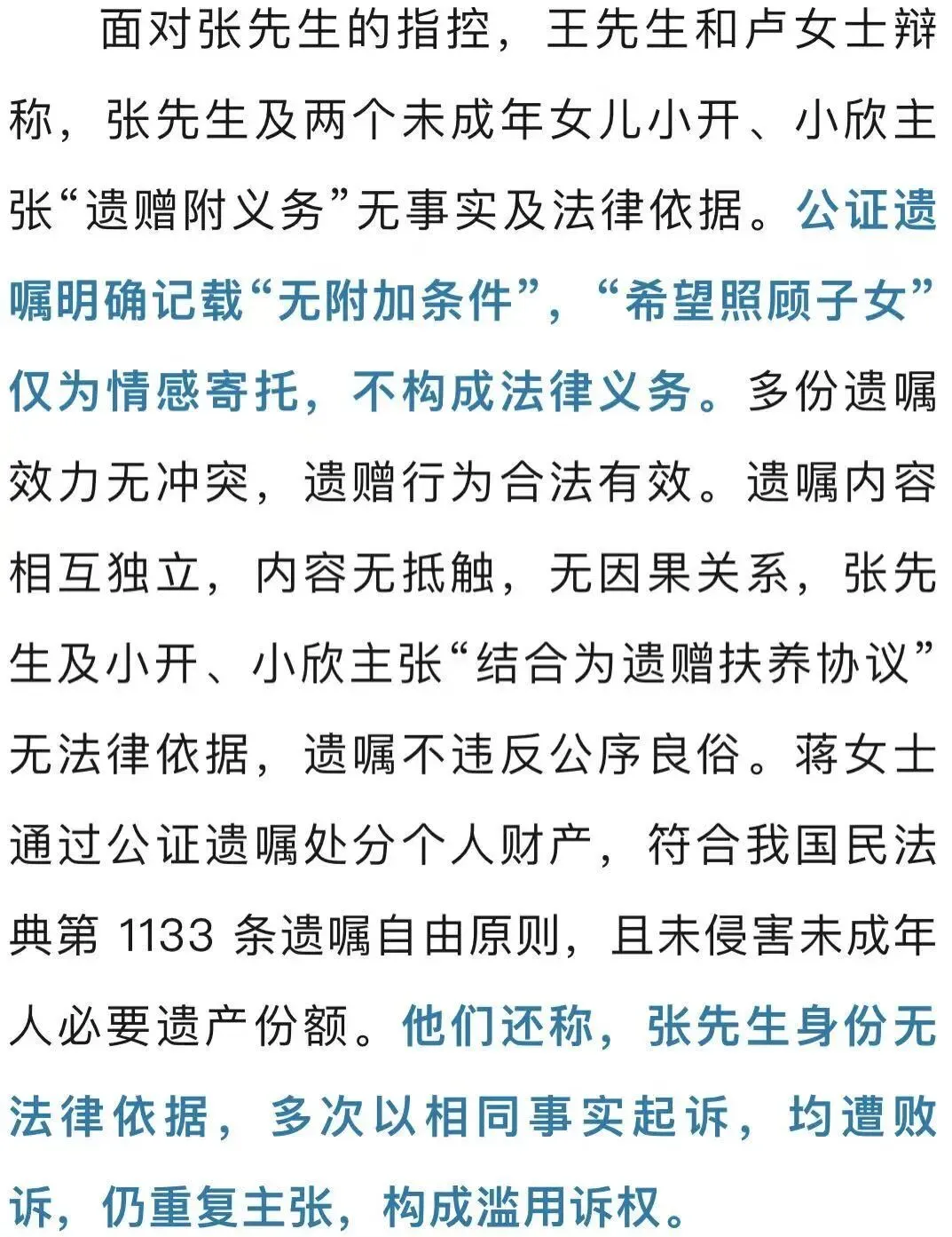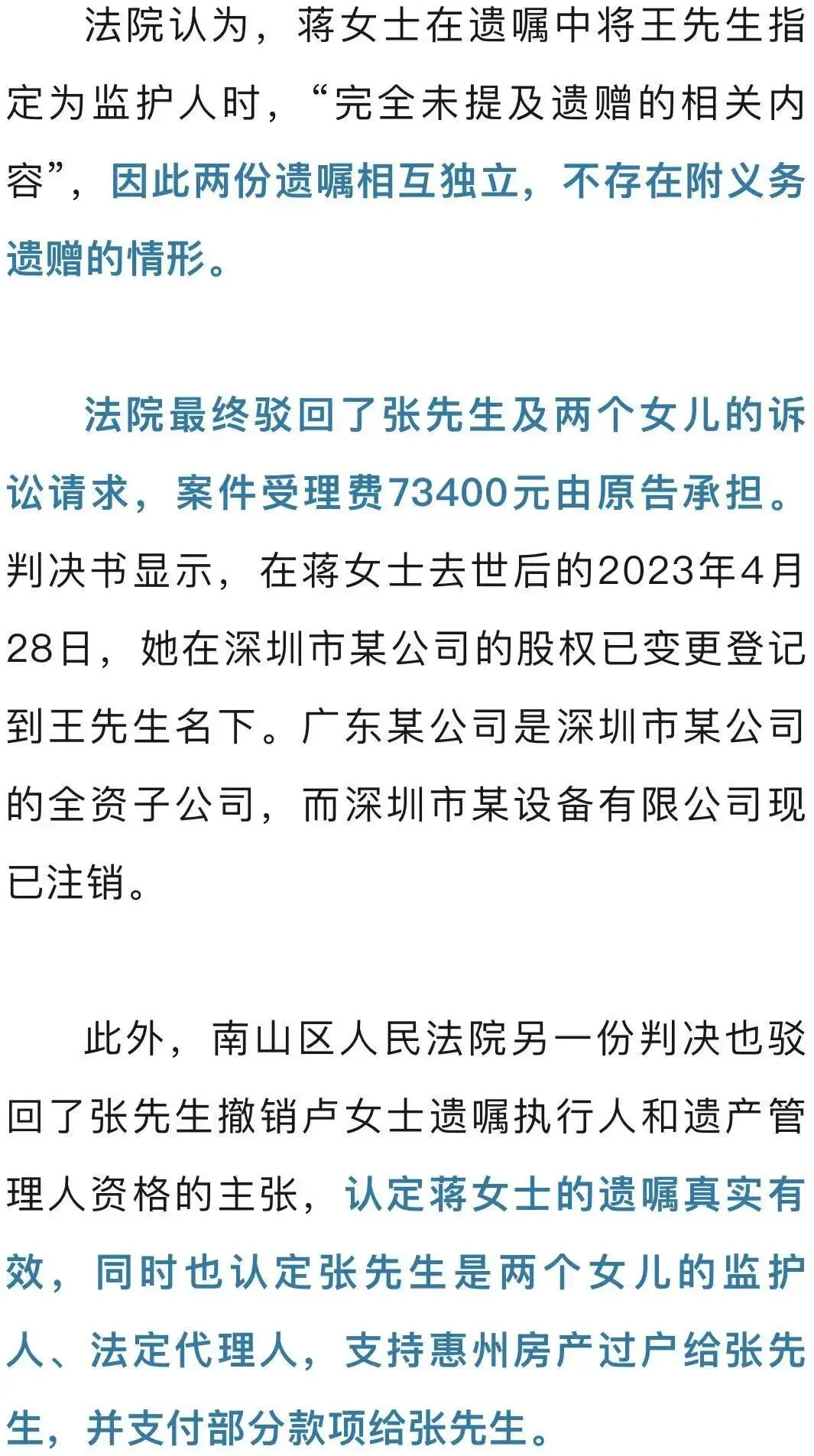 今年1月,张先生收到法院判决书。南山区人民法院经审理认为,案件为遗赠纠纷。根据我国民法典规定,遗嘱继承或者遗赠附有义务的,继承人或者受遗赠人应当履行义务。但本案中,蒋女士在遗嘱中表述的“希望”王先生照顾其女儿,并非对接受遗赠设定的条件和义务。
