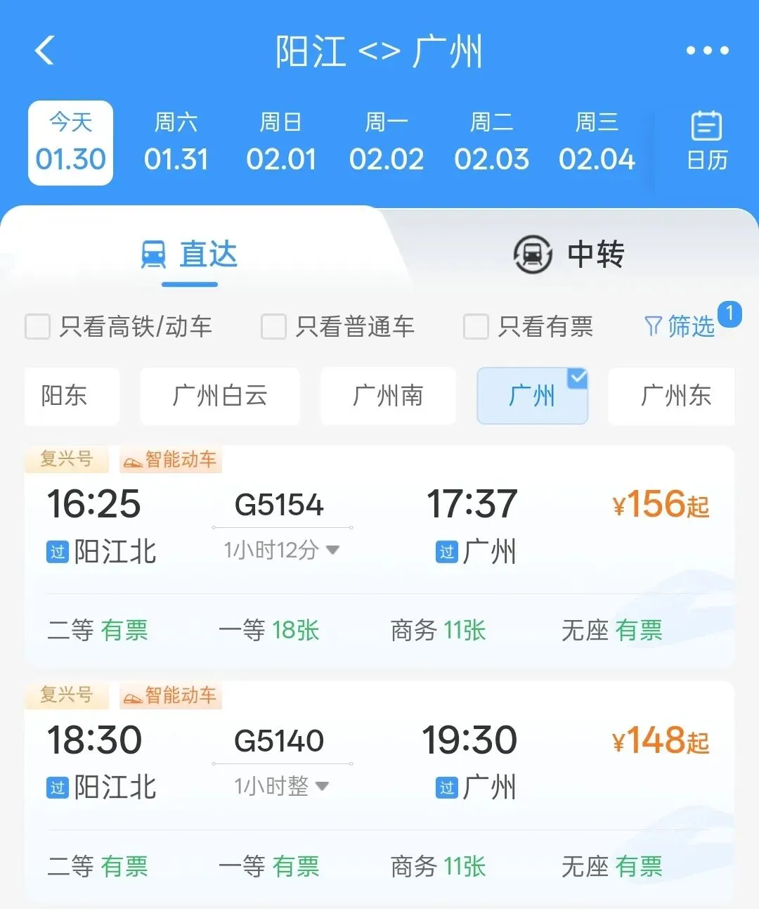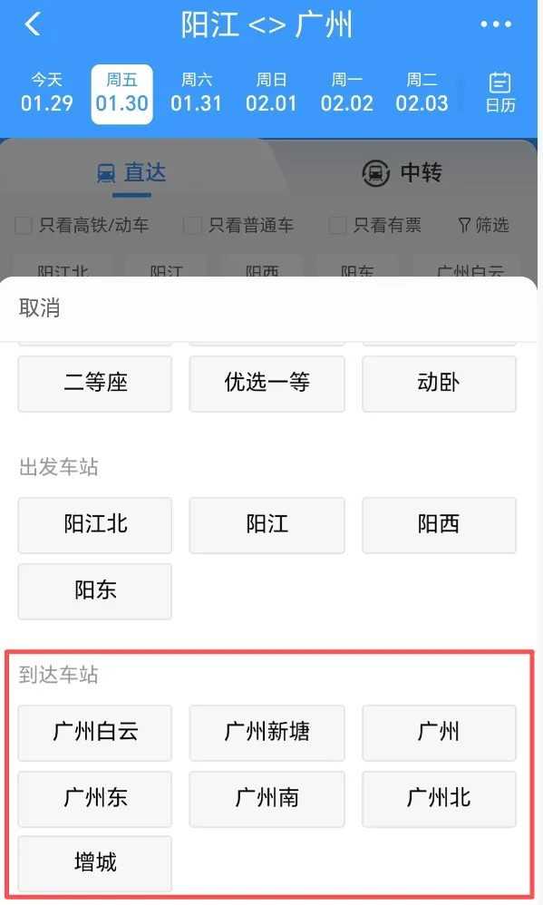 1月30日阳江出发经停广州站部分车次