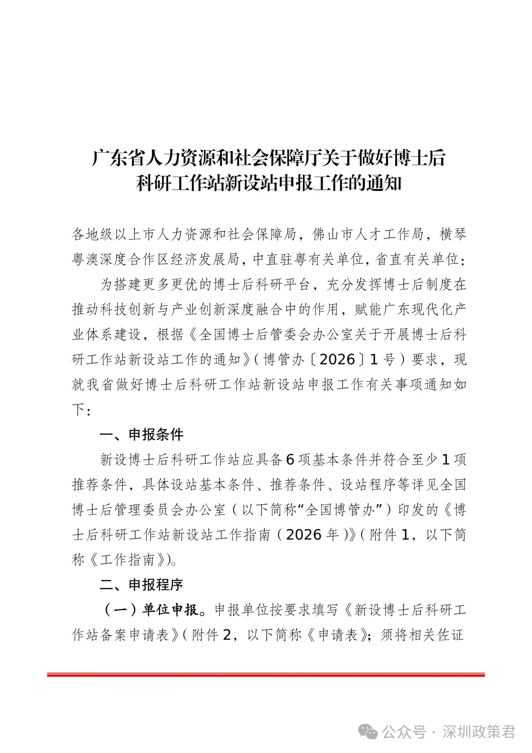 根据《广东省人力资源和社会保障厅关于做好博士后科研工作站新设站申报工作的通知》(以下简称《通知》,详见附件)要求,现就我市2026年博士后科研工作站新设站申报推荐工作通知如下: