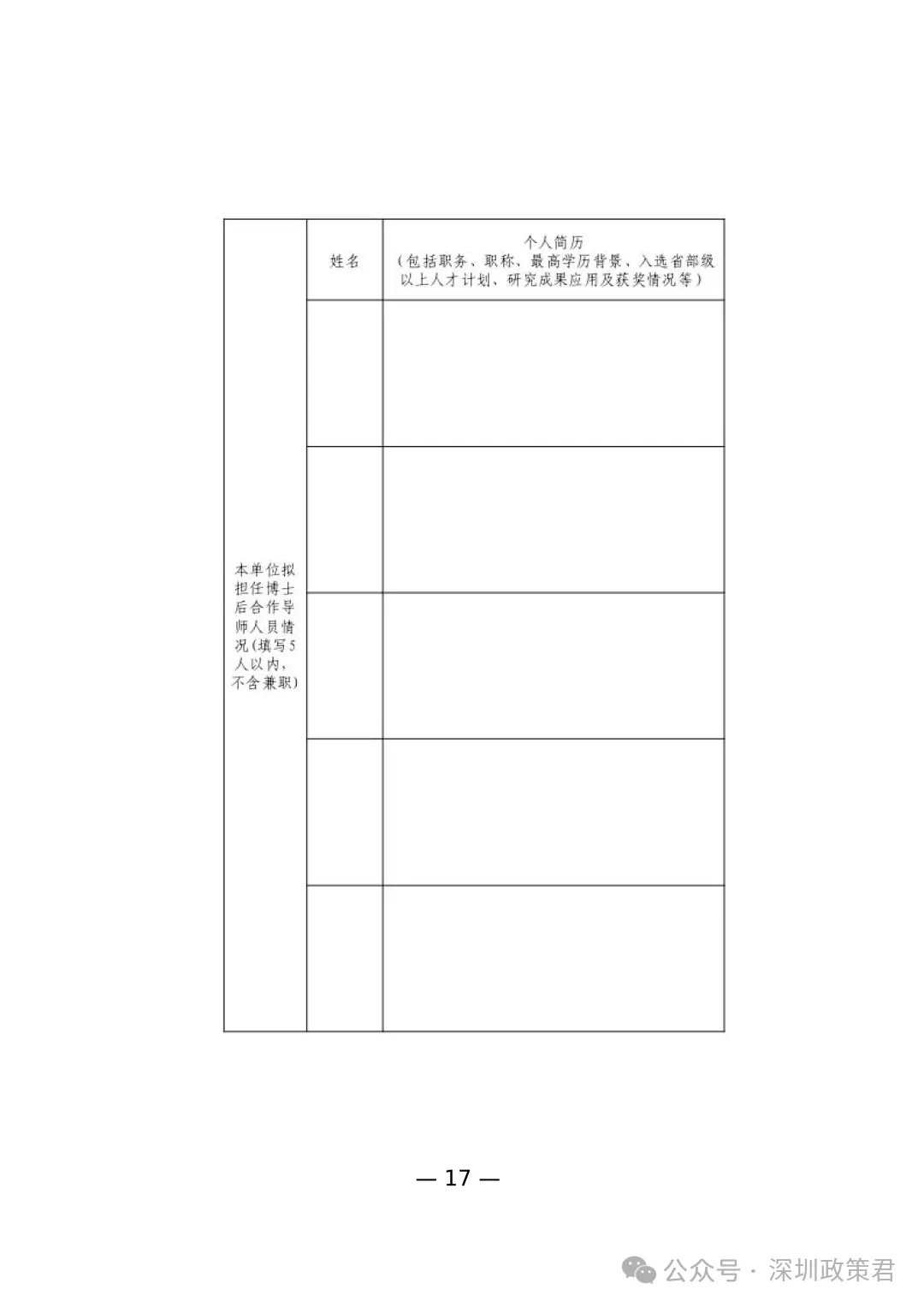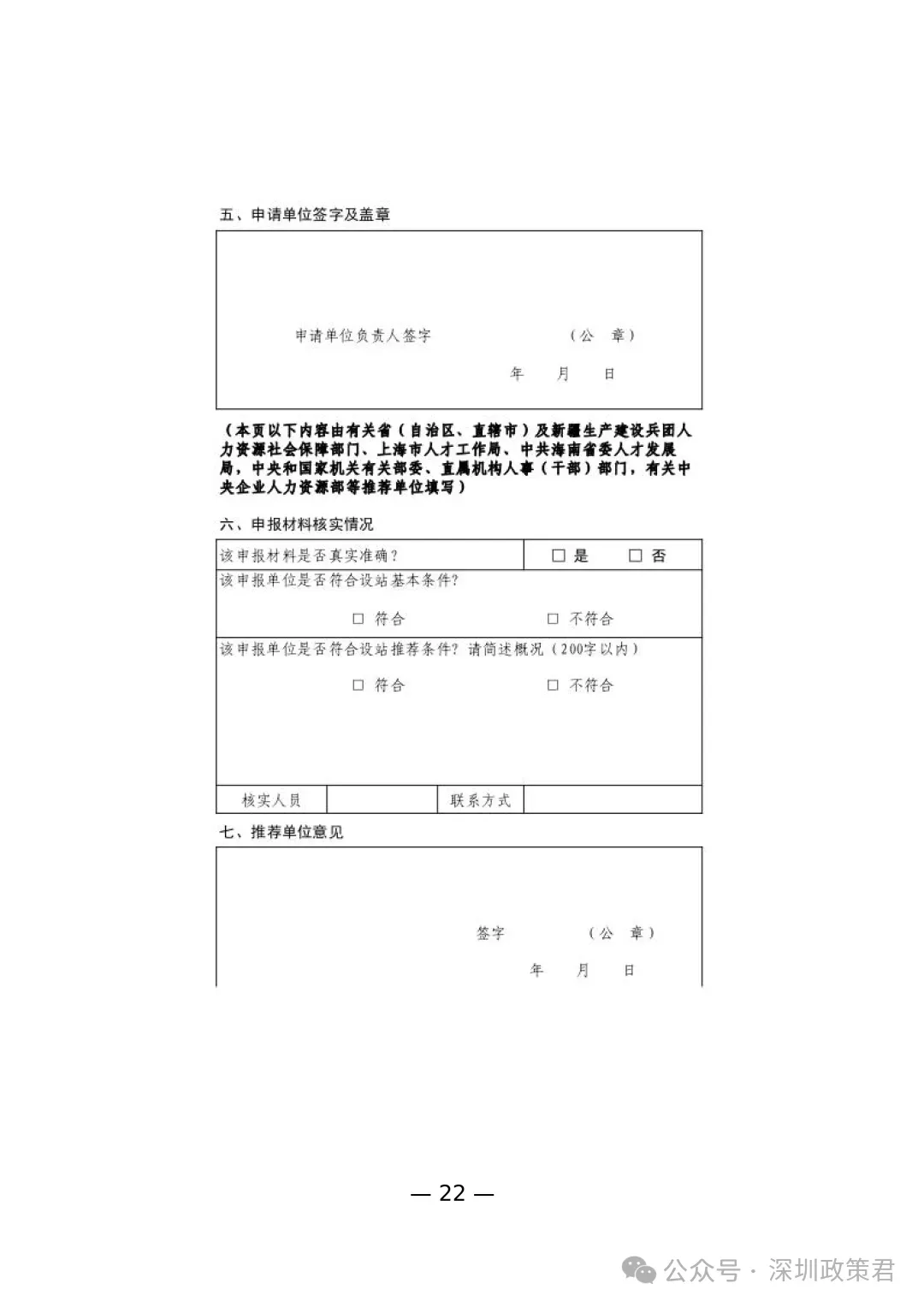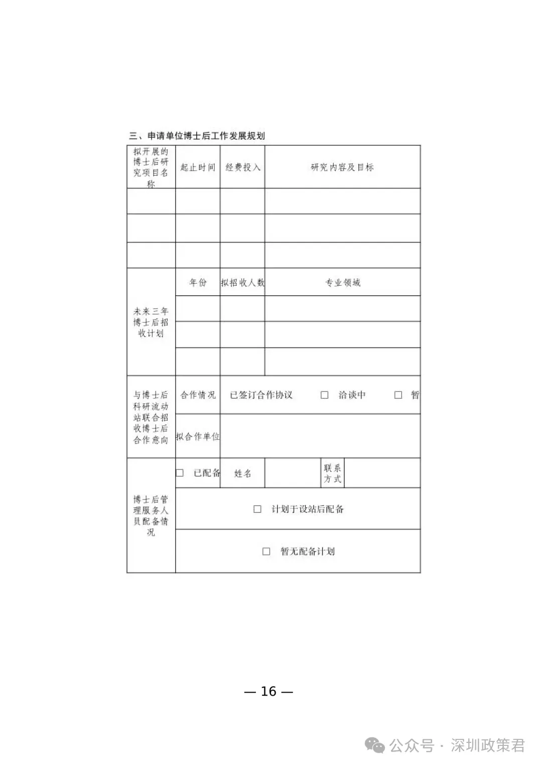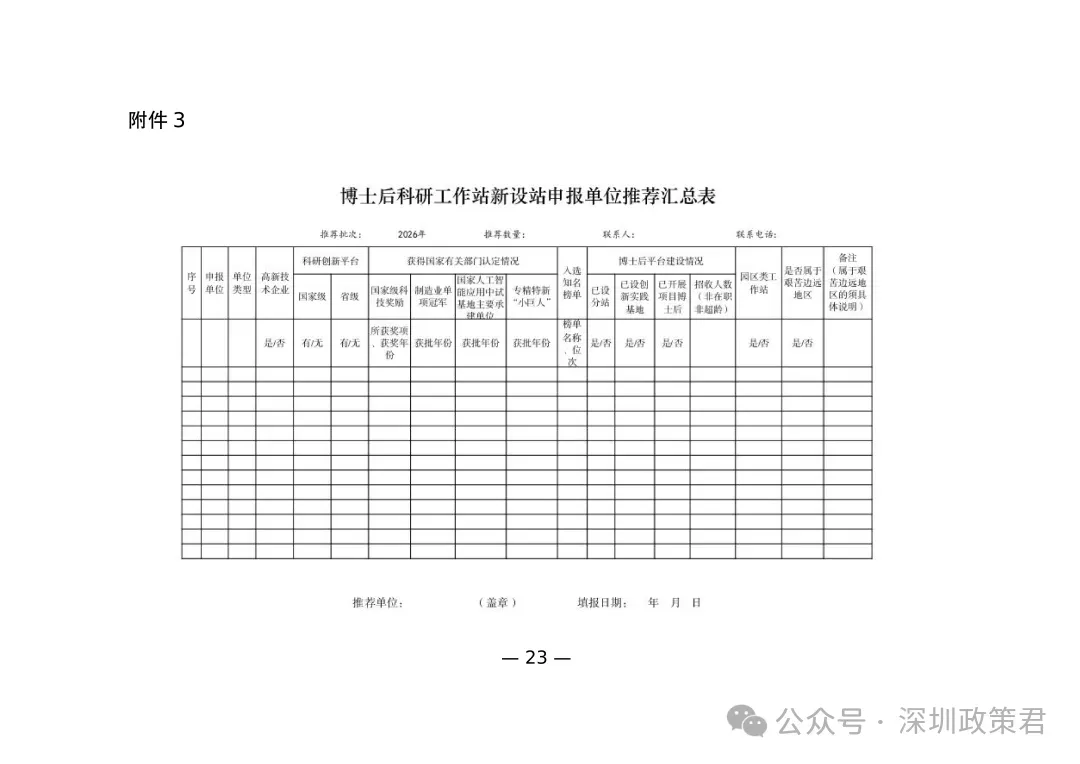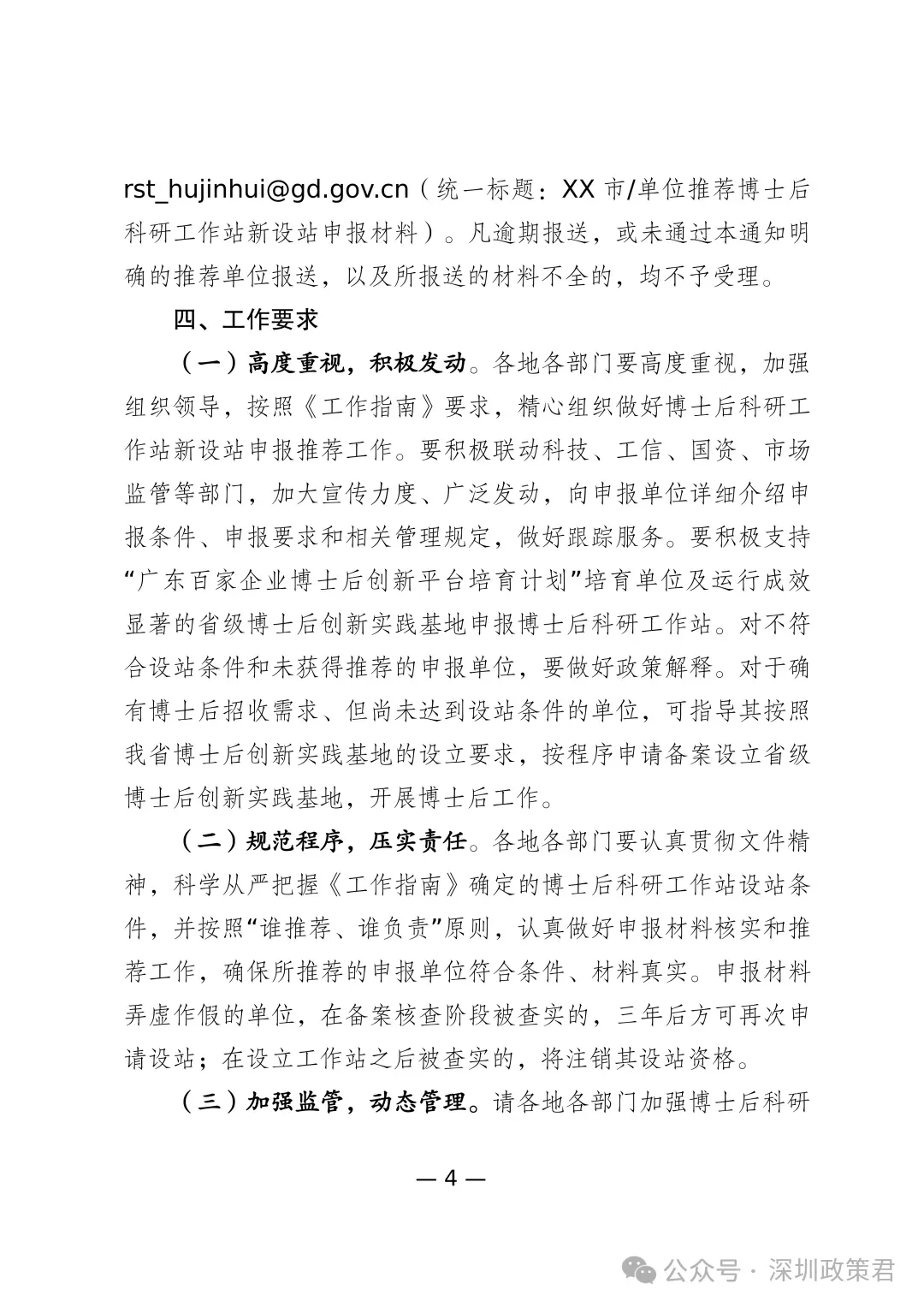 请各申报单位严格按照《通知》要求,符合申报条件的及时提交材料。申报单位须真实、完整、准确填写《新设博士后科研工作站备案申请表》及佐证材料,并于2026年2月12日(星期四)下班前将纸质申报材料通过EMS邮寄至我局(深圳市福田区深南大道8005号深圳人才园6038室,电话0755-88122067),同时将申报材料Word可编辑版及PDF电子版发送至政务邮箱zyjs@hrss.sz.gov.cn(统一标题:XX单位博士后科研工作站新设站申报材料),逾期未申报视为放弃申请。
