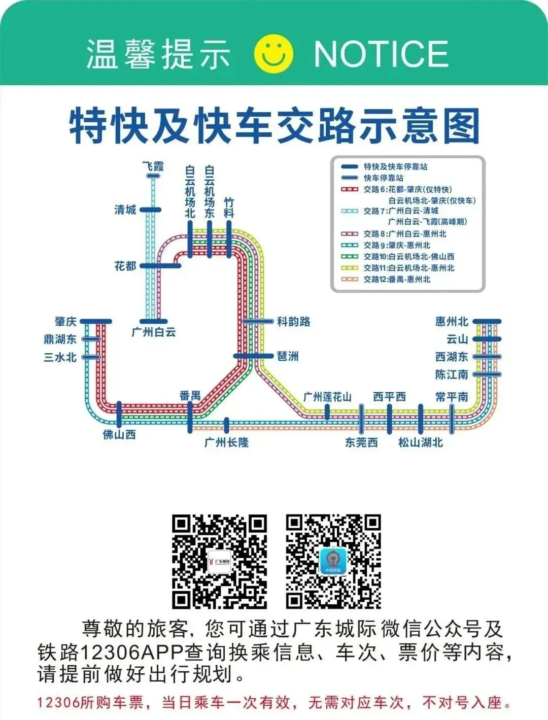 旅客出行前可通过广州地铁APP“城际出行助手”、广东城际官方微信公众号“城际出行助手”“运营时刻表”子栏目或铁路12306查询列车时刻表,合理规划行程,预留充足的乘车时间。