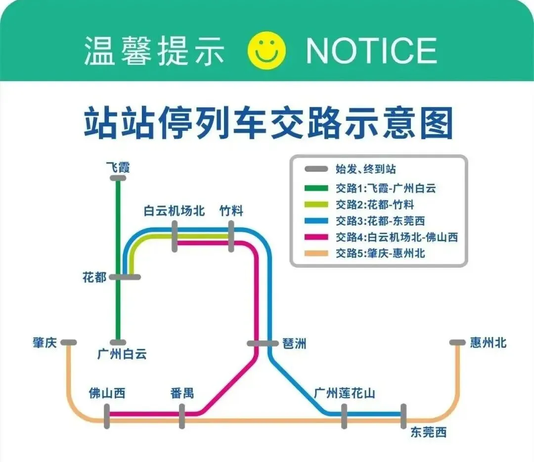 据了解,结合新线开通,广东城际将调整部分线路运行图及始发站点。调整后,广东城际全天开行5条站站停交路,7条特快列车、大站快车交路。