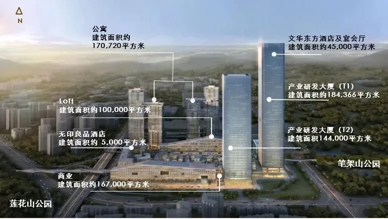 项目规划了两座产业研发大厦,T1塔高约388米,T2塔高298米。