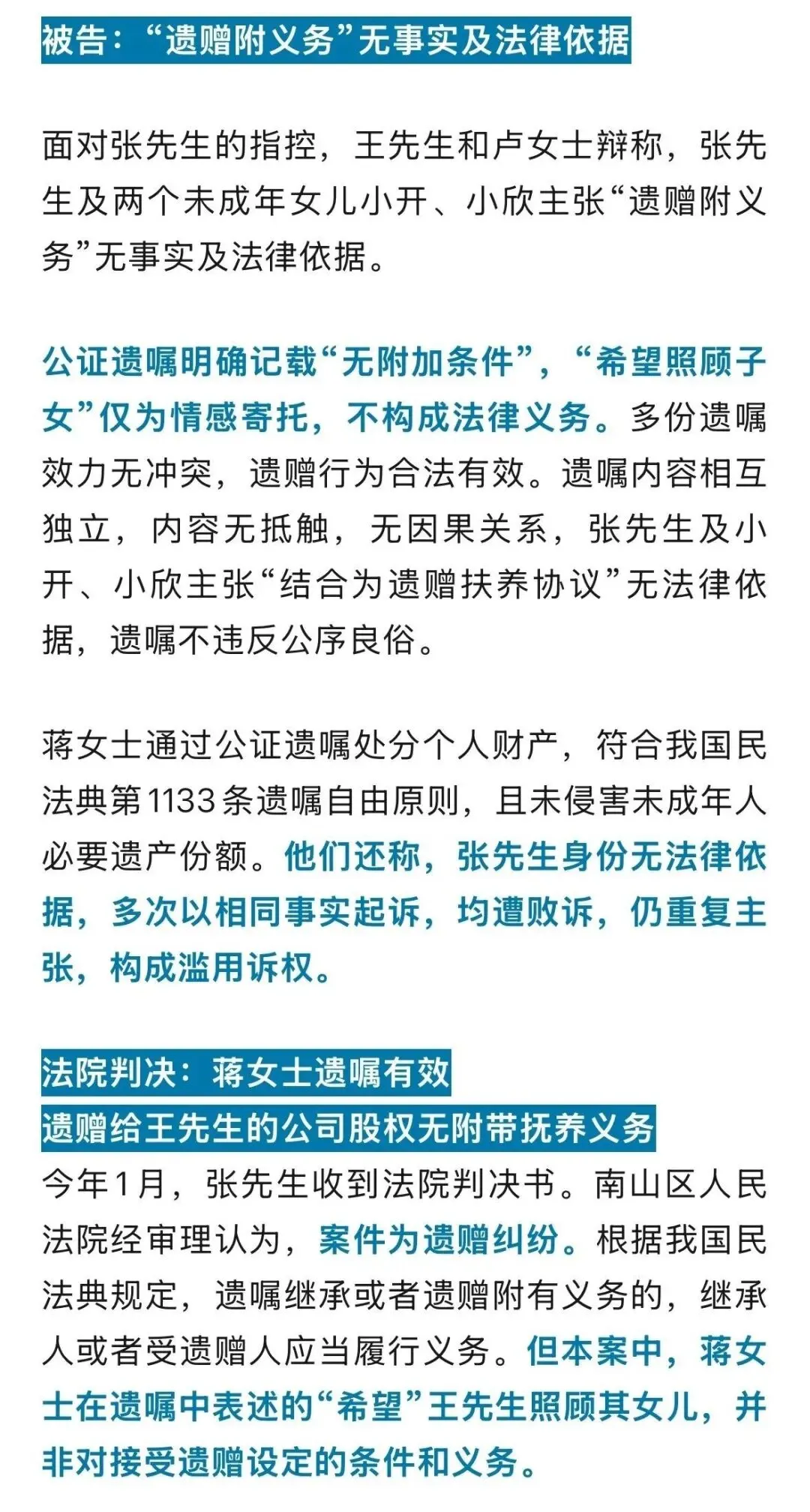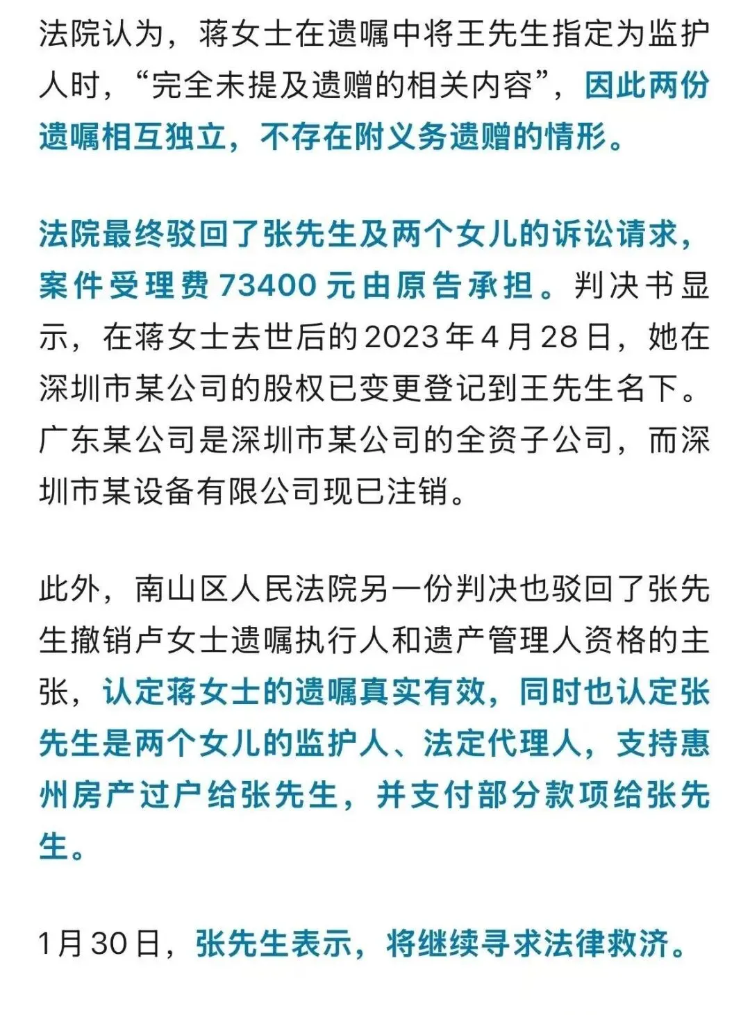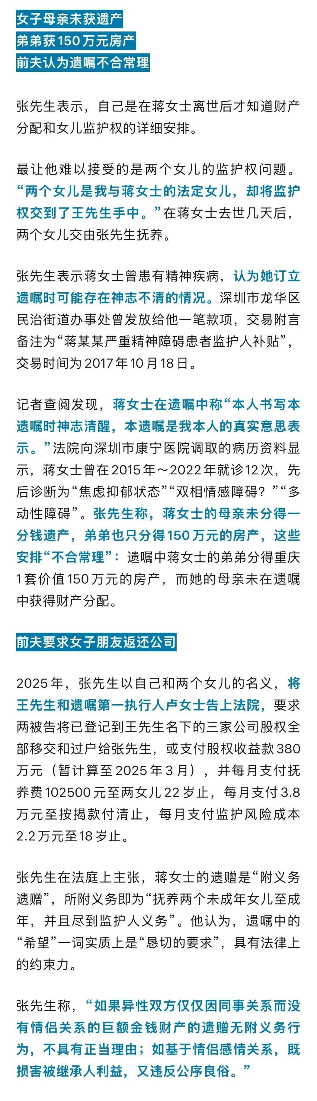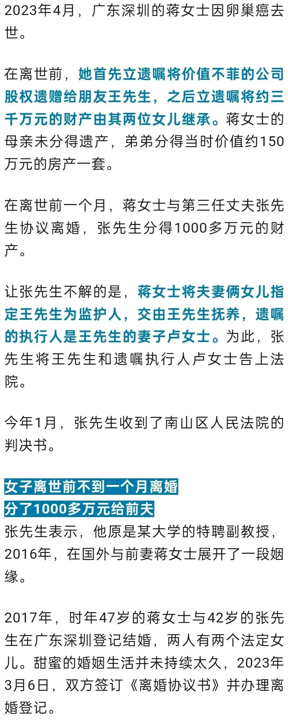 在与张先生离婚前,2023年1月30日,蒋女士已订立一份公证遗嘱,将其名下深圳市某公司、广东某公司、某设备公司的股权及相应权益,全部遗赠给朋友王先生。