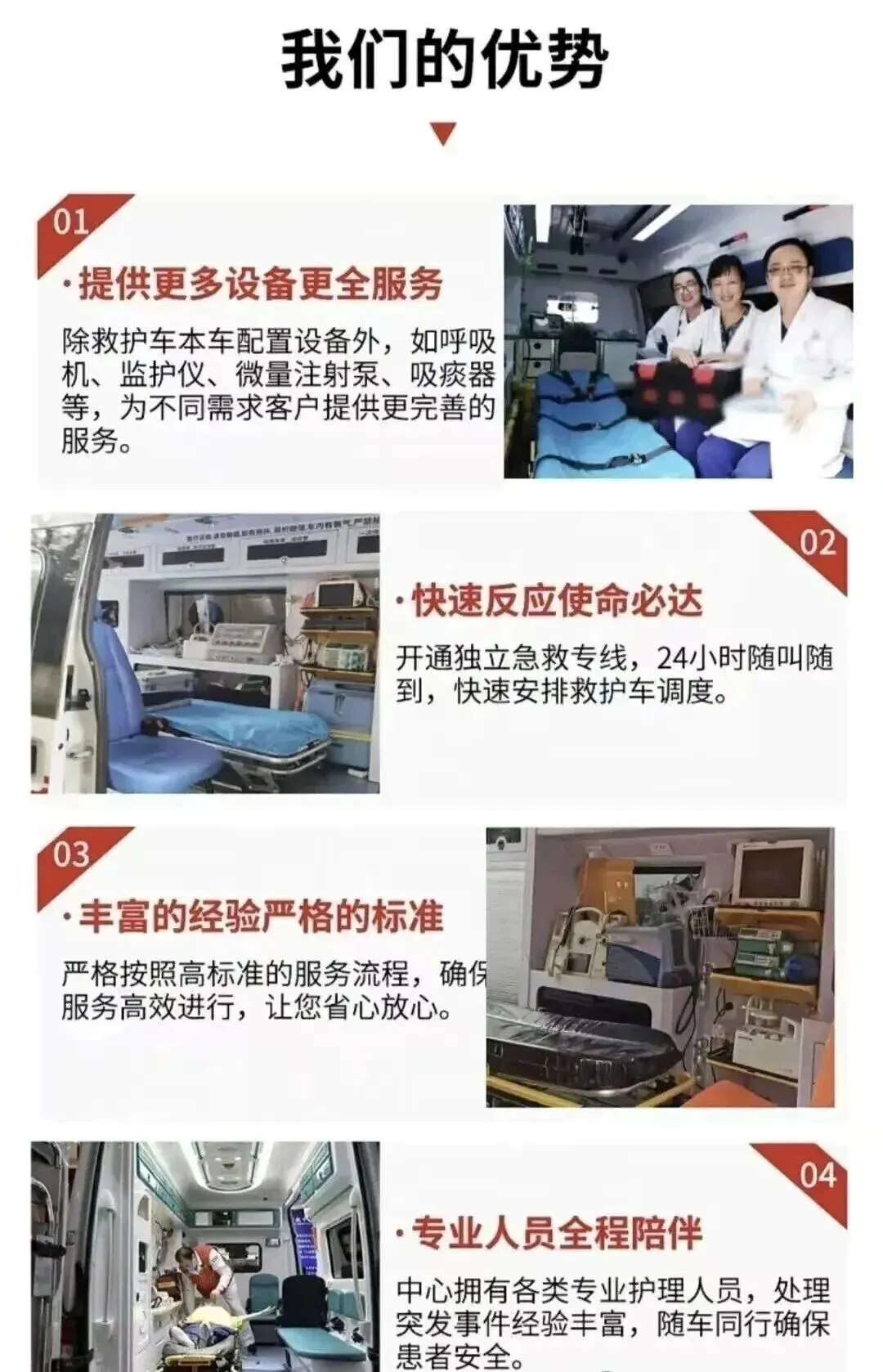 :正规救护车资质,配备 stretcher床、氧气瓶、心电监护仪等医疗设备,满足不同病情需求。
