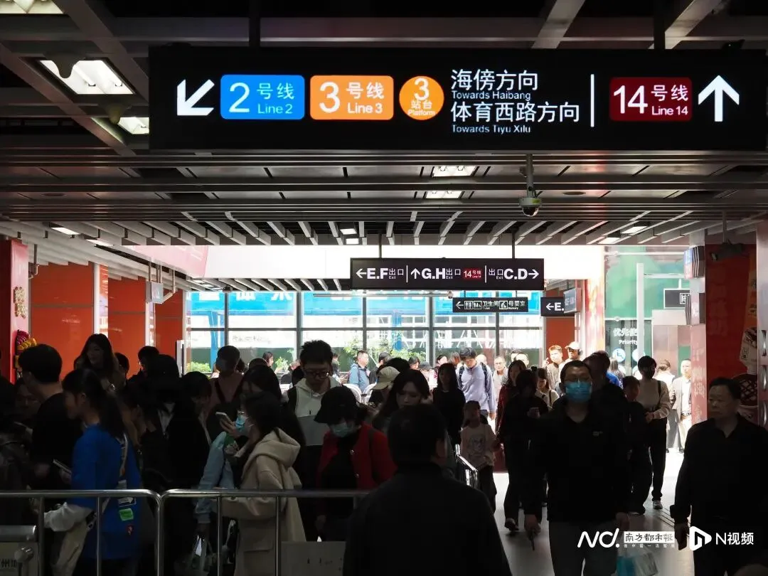 1月29日,南都记者乘地铁抵达嘉禾望岗站。站厅内人流如织,各有“经纬”——乘客们通过地铁2号线、3号线或14号线来到这里,或走向不同站台,去往各自的目的地。