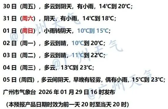 广州市气象台预计,1月30日受东南气流影响,广州雨雾天气渐趋明显。1月31日起受中等强度冷空气影响,广州小雨转阴天,偏北风增大到5~6级,港区和高地6~8级,过程降温4~6℃。2月1日将出现此次降温过程最低气温,只有10℃左右。