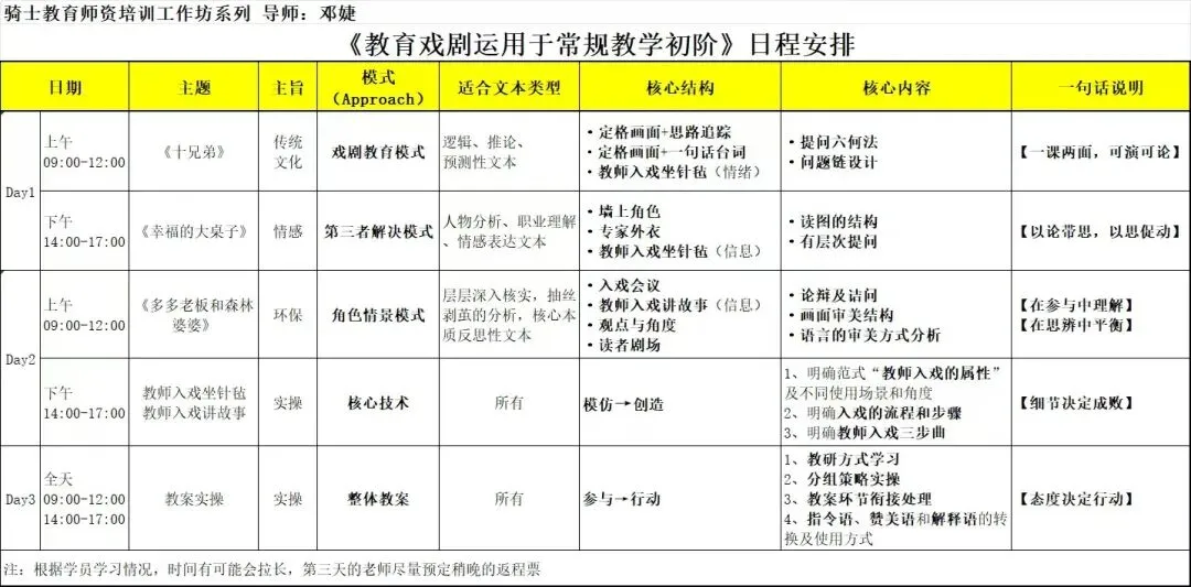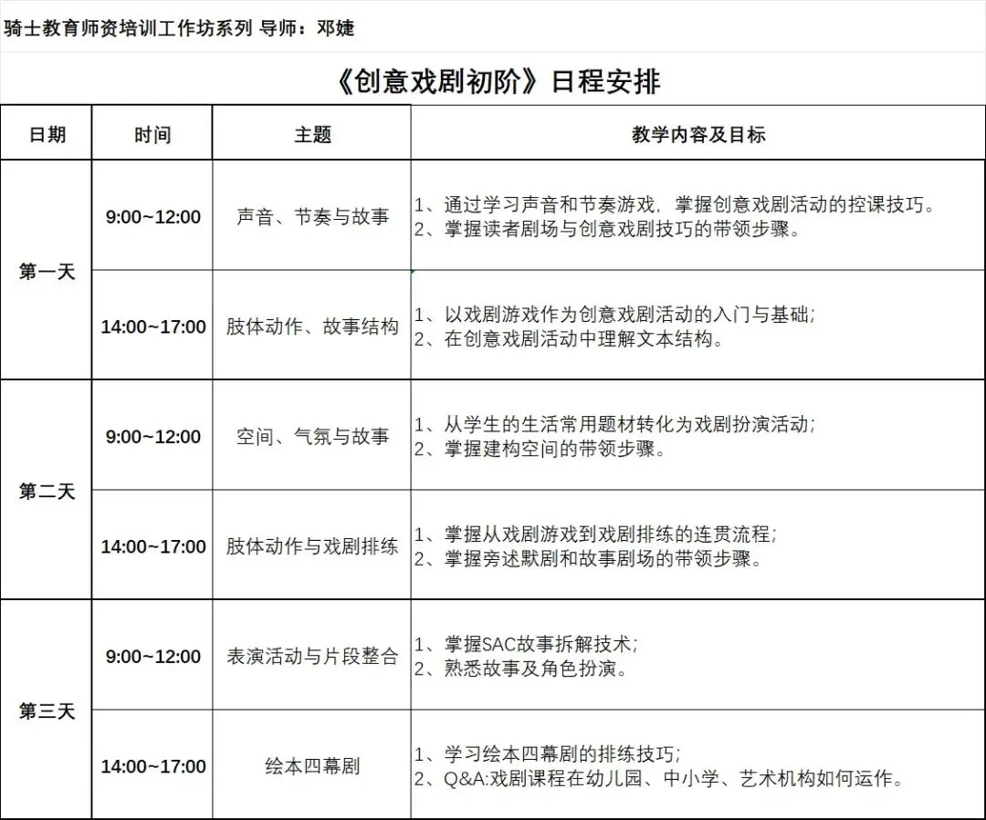 6、由骑士教育颁发的课时证明证书。系列可以直接转化到教学上运用的戏剧游戏和范式。系列可以直接转化到教学上运用的戏剧游戏和范式。7、创意戏剧的元素:戏剧游戏、扮演技巧、串联策略、表演技术及欣赏反思。8、如何组织和带领学生完全自由即兴创作的戏剧排练活动。9、如何组织和带领学生从剧本或儿童文学为基础的戏剧排练活动。深圳骑士教育联合创始人