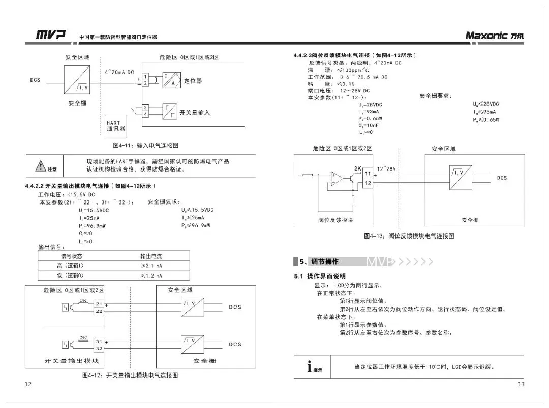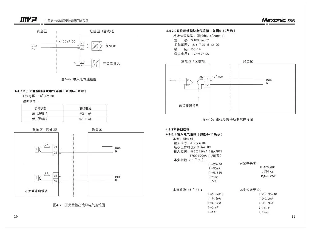 - 阀位反馈模块:两线制,4~20 mA DC,本安参数需满足要求。