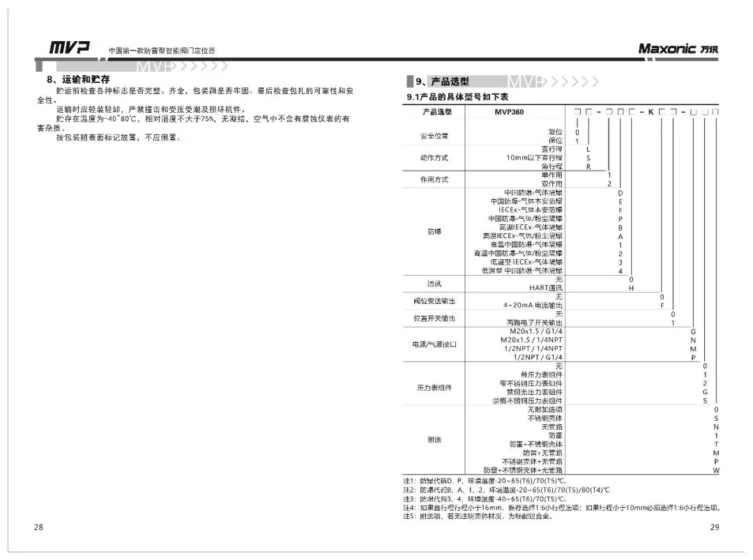 注:1. 防爆代码D、P,环境温度-20~65(T6)/70(T5)℃。2. 防爆代码B、A、1、2,环境温度-20~65(T6)/70(T5)/80(T4)℃。3. 防爆代码3、4,环境温度-40~65(T6)/70(T5)℃。4. 如果直行程行程小于16mm,推荐选择1:6小行程选项;如果行程小于10mm必须选择1:6小行程选项。5. 附选项,若无注明壳体材质,为标配铝合金。