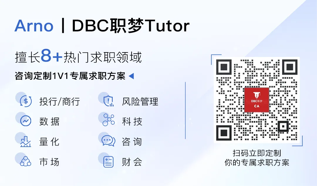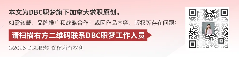 不论是求职资讯还是求职技能,DBC职梦都有来自金融、咨询、券商、互联网、快消等行业的在职导师手把手教学指导。扫码回复暗号【加拿大咨询】,即可预约名企导师1V1打造提升计划!DBC职梦将继续秉承“成就留学生职场精英梦”的初衷记得动动手指戳戳星标置顶或收藏哟