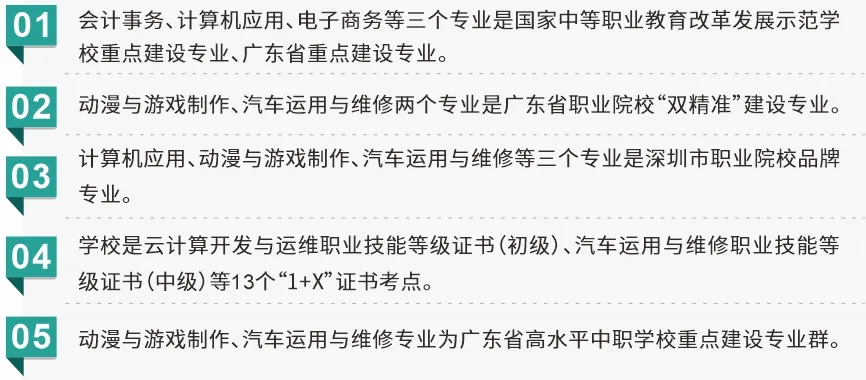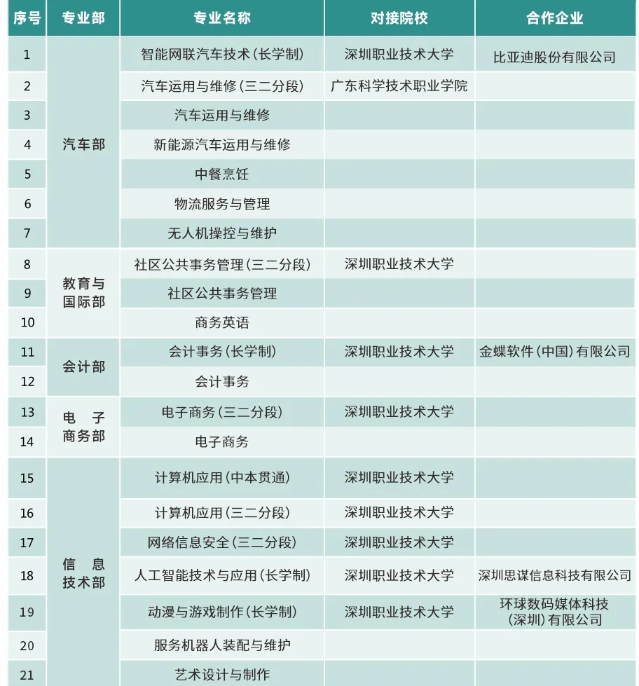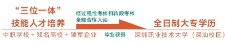 我校联合深圳职业技术大学,与比亚迪股份有限公司、深圳思谋信息科技有限公司、环球数码媒体科技(深圳)有限公司、金蝶软件(中国)有限公司合作,构建“中职学校+知名高校+领军企业”的“三位一体”技能人才培养体系。经过程性考核和转段考核全部合格入读深圳职业技术大学,毕业获得全日制大专学历。