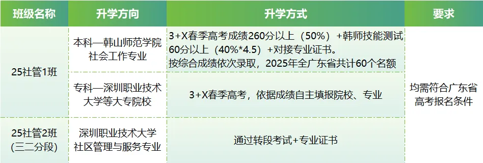 社区公共事务管理专业是深圳市“十大紧缺专业”之一,学生可全额获得助学金资助,可报考韩山师范学院本科社会工作专业,可通过“三二分段”入读深圳职业技术大学社区管理与服务专业,同时也可通过技能大赛锤炼专业技能、完善自身发展。