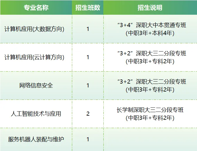 计算机应用专业成立于1997年,是深圳市首批中职品牌专业、校内首个广东省重点专业、国家职业教育改革和发展示范校重点支持专业、广东省高水平专业群核心专业。本专业主要培养新一代信息技术云计算、大数据领域的高技能人才。2023年,开设深圳职业技术大学三二分段中高贯通直升专班,2025年开设深圳职业技术大学中本贯通直升专班,专业发展不断注入新动能,继续在快车道上疾驶。