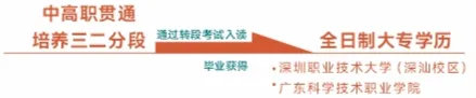 我校与深圳职业技术大学、广东科学技术职业学院开展广东省职业院校中高职贯通培养三二分段试点工作。通过转段考试入读深圳职业技术大学或广东科学技术职业学院,毕业获得全日制大专学历。