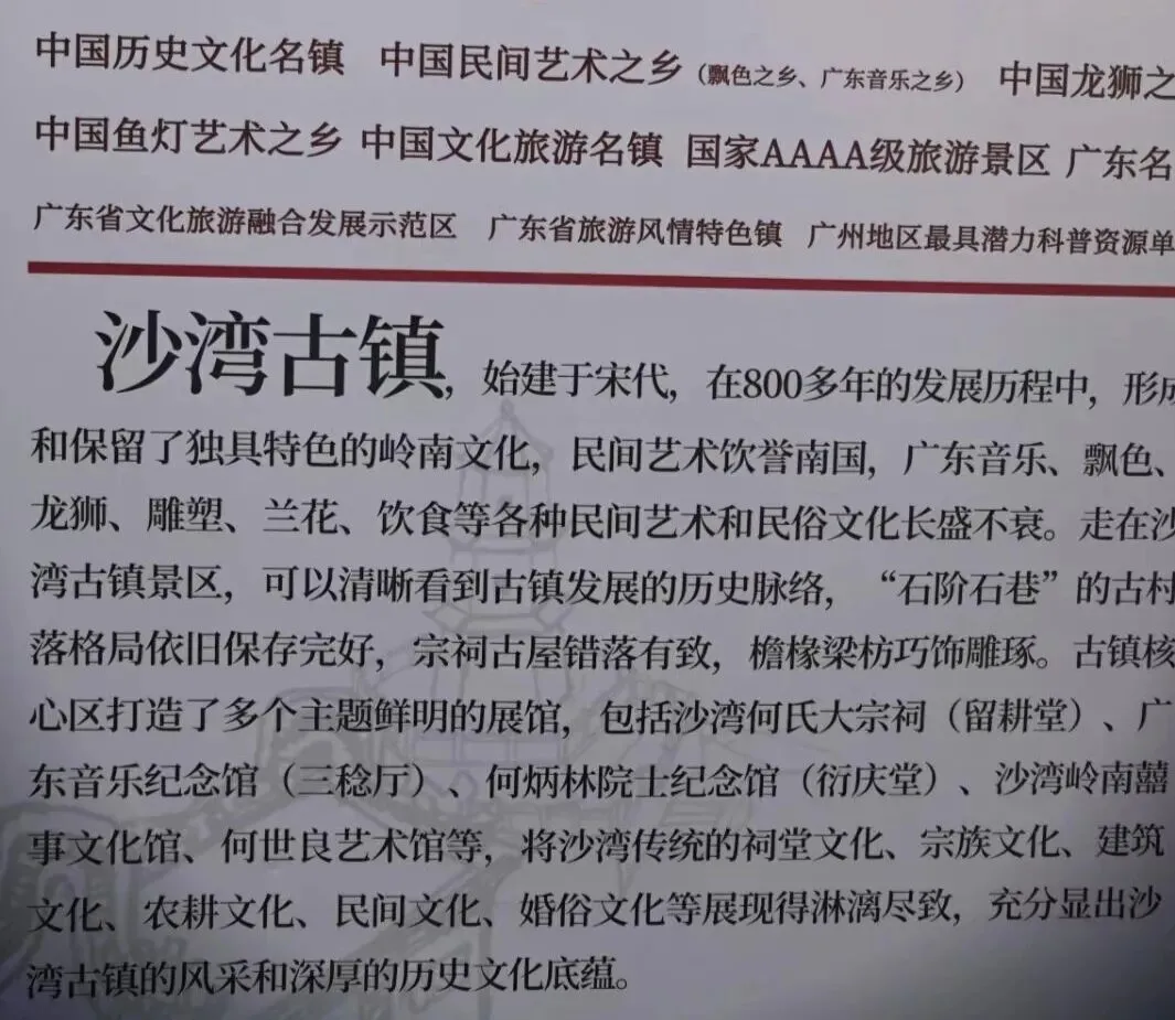 沙湾古镇留耕堂何氏大宗祠的古建筑最为著名,是岭南宗祠建筑的代表,展现了木雕、砖雕、石雕工艺的精湛。