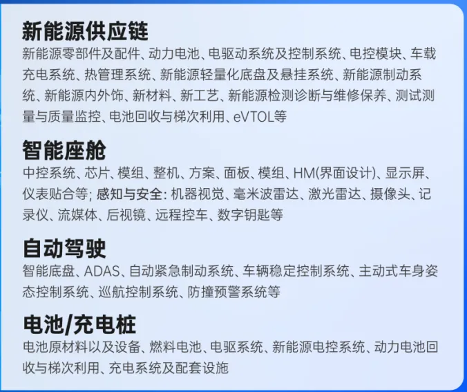 汽车科技展区以“中国汽车科技年度首发平台”为定位,重点覆盖智能座舱、自动驾驶、电池/充电桩及新能源供应链等关键领域,集中呈现汽车产业智能化与电动化的最新发展成果。