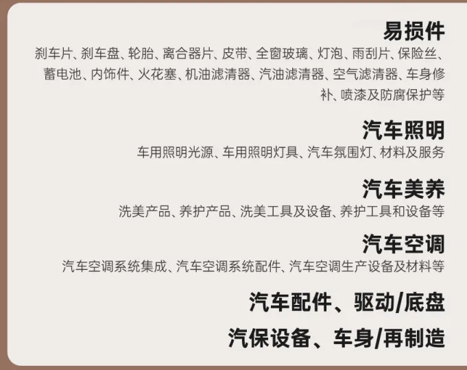 汽车零部件展区覆盖刹车片、滤清器等易损件、汽车照明、美养及空调等全品类产品,旨在精准对接整车厂、4S店集团等专业买家,为国内外企业搭建商贸合作桥梁,助力其拓展全球供应链布局。