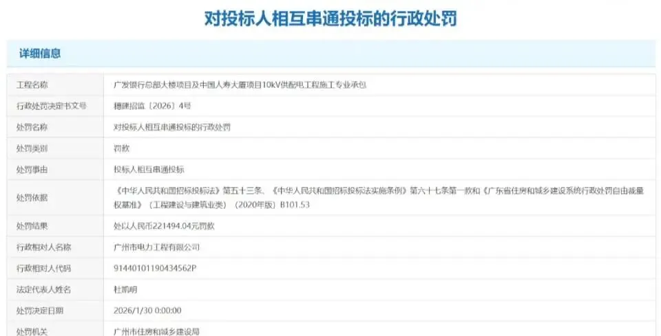 近日,从公开信息了解,2026年1月30日,监管部门公布了对广发银行总部大楼项目及中国人寿大厦项目10kV供配电工程施工专业承包项目投标人相互串通投标的行政处罚,对广州市电力工程有限公司、广州市光大电力工程有限公司分别行政处罚221494.04元。