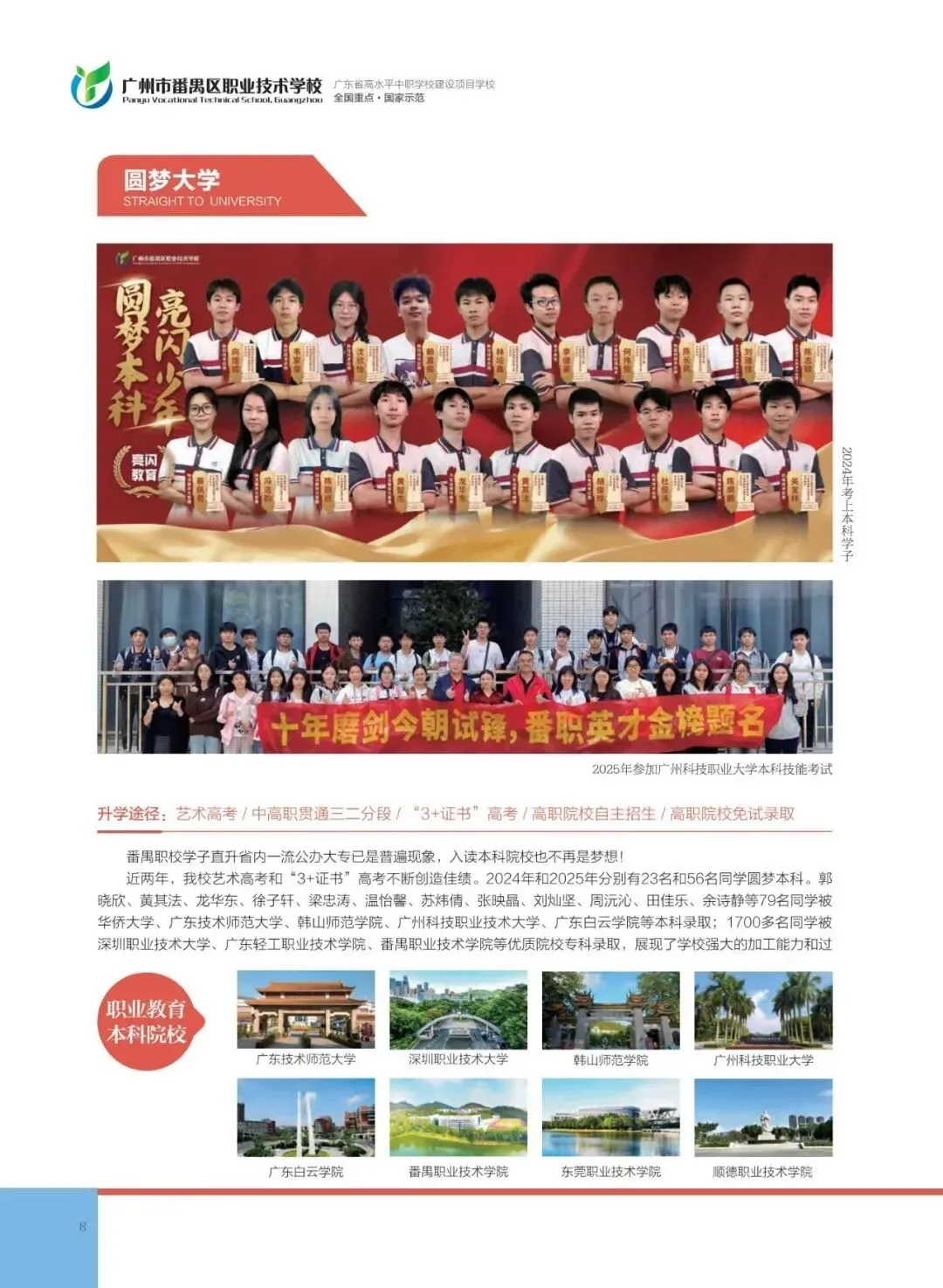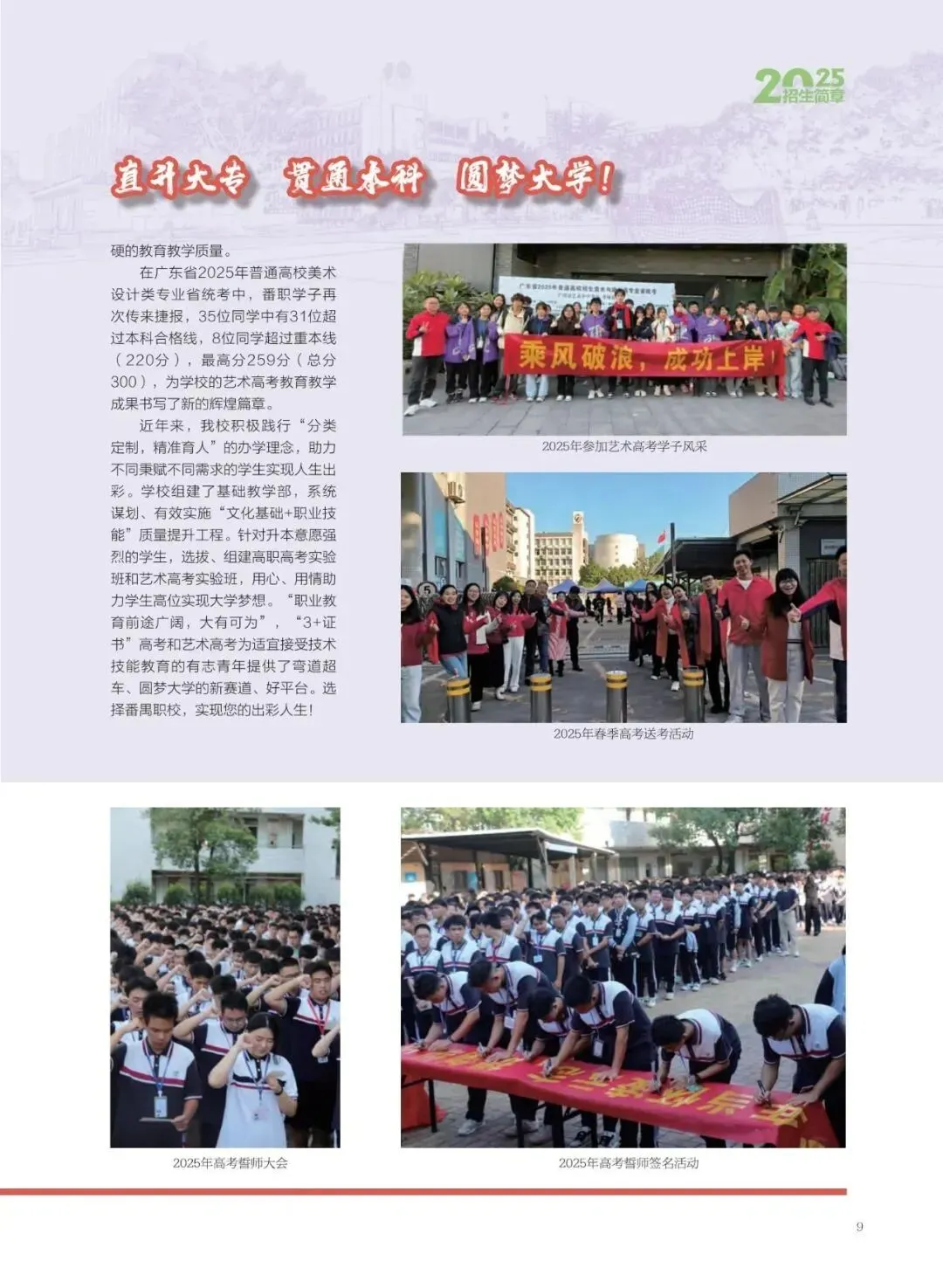 近两年,学校艺术高考和“3+证书”高考不断创造佳绩。2024年和2025年分别有23名和56名同学圆梦本科。1700多名同学被深圳职业技术大学、广东轻工职业技术学院、番禺职业技术学院等优质院校专科录取,展现了学校强大的加工能力和过硬的教育教学质量。在广东省2025年普通高校美术设计类专业省统考中,番职学子再次传来捷报,35位同学中有31位超过本科合格线,8位同学超过重本线(220分),最高分259分(总分300),为学校的艺术高考教育教学成果书写了新的辉煌篇章。