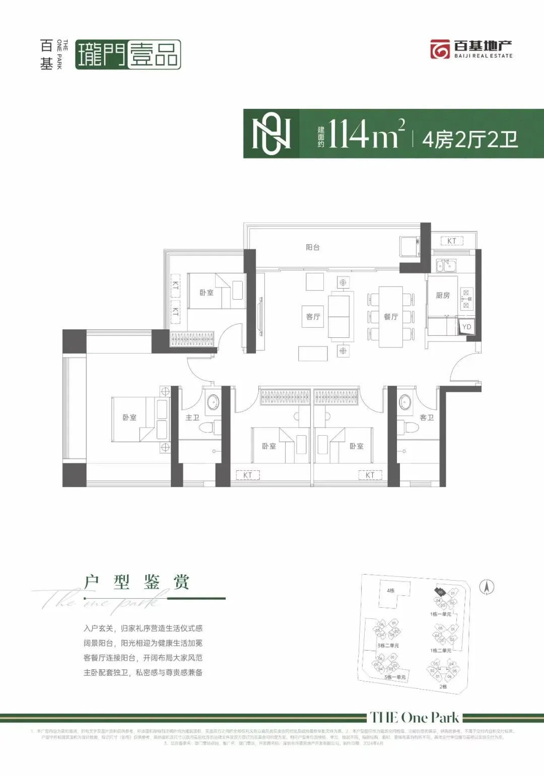 116㎡的4房2厅2卫,设计的是横厅南北通透格局,进门入户玄关,客餐厅6米开间,LDKB一体化设计,五开间朝南,4个卧室分别做到了3.775米/3.2米/2.6米/2.575米的宽度,主卧三面飘窗,6米长的大阳台,L型厨房,卫生间干湿分离,得房率:70.65%(不含赠送),阳台主朝东南向。