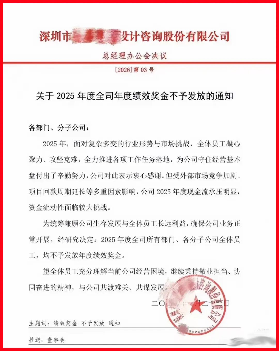 2026年初,深圳某设计咨询公司发布通知:“2025年度全司所有部门,各分子公司全体员工,均不予发放年度绩效奖金。”