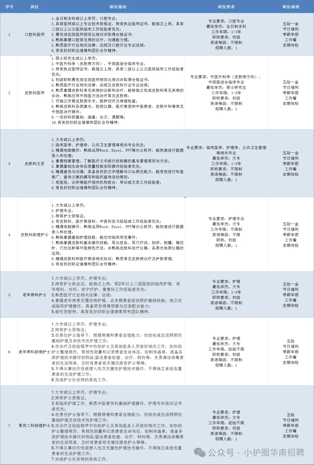 因医院业务发展需要,现需招聘合同制口腔科医师1名、皮肤科医师1名、皮肤科文员1名、皮肤科助理护士1名、老年病科护士1名、老年病科助理护士1名、骨伤二科助理护士1名。具体要求如下表: