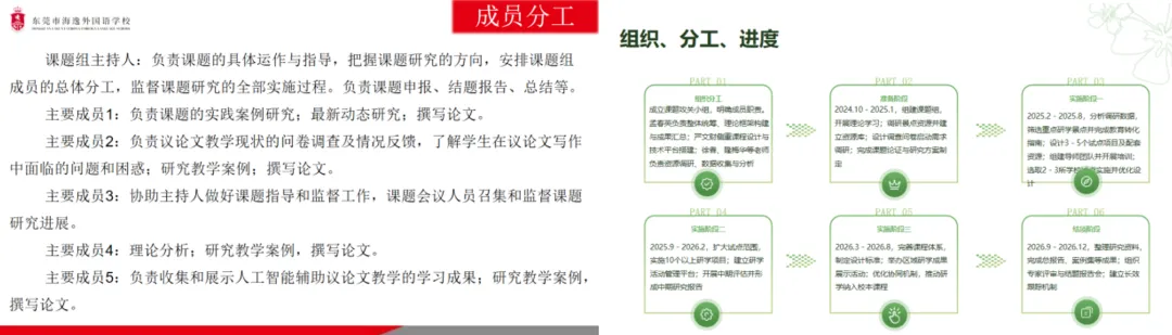 语文组课题由主持人余秋阳负责统筹,其成员李烜、马良彬、胡蝶、范芷雅、曾萍各司其职,分别开展案例、动态、理论研究、问卷调研、成果收集、会议协调等,旨在探索AI技术驱动下的高中议论文写作人机协同新模式,直击传统教学痛点,为语文教学的数字化转型开辟了可行路径。