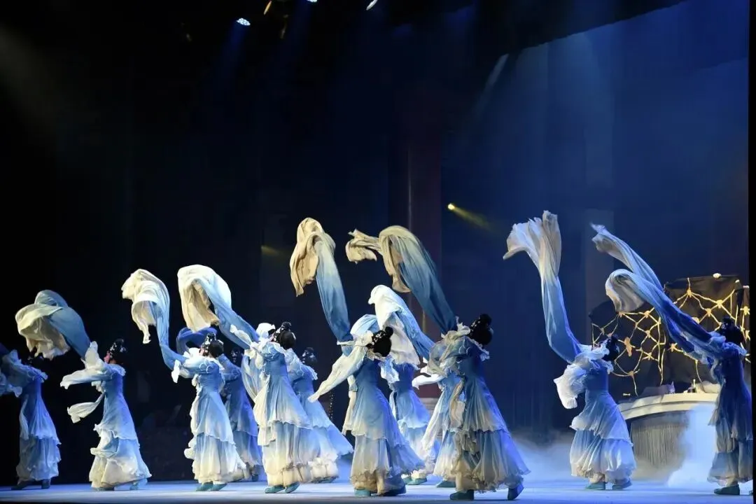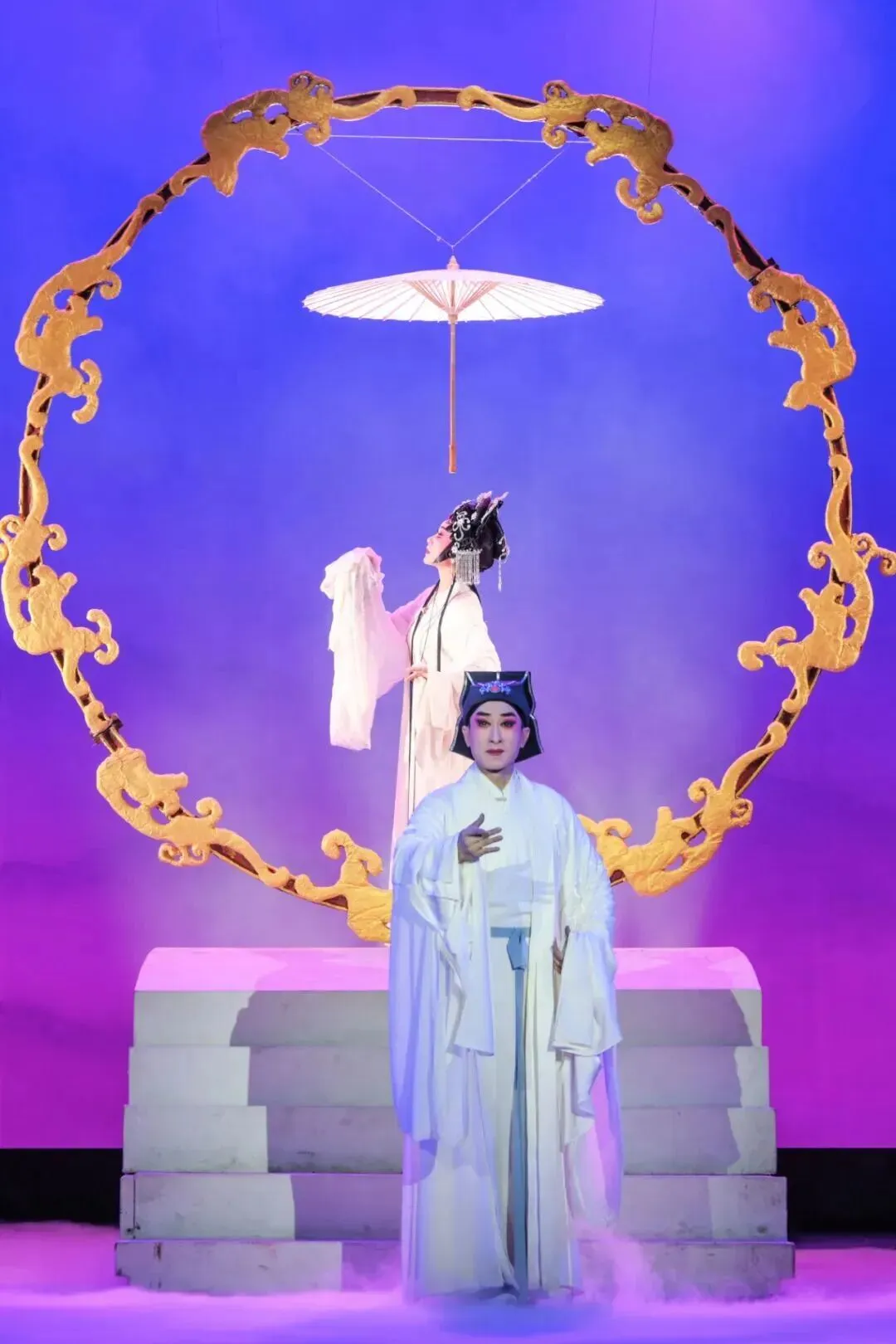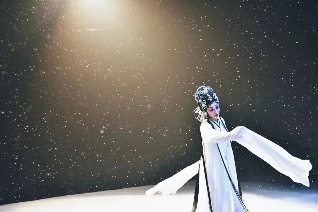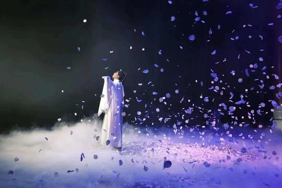 舞台上,西湖迷蒙雾雨、空旷自然,好似仙境。山河湖海,桥头岸边,一把纸伞撑起,成就一场姻缘;寺庙佛塔,惊浪滔天,一排水袖甩出,正是水漫金山。整个舞台仿若一幅山水墨图缓缓展开,尽显东方写意美学。