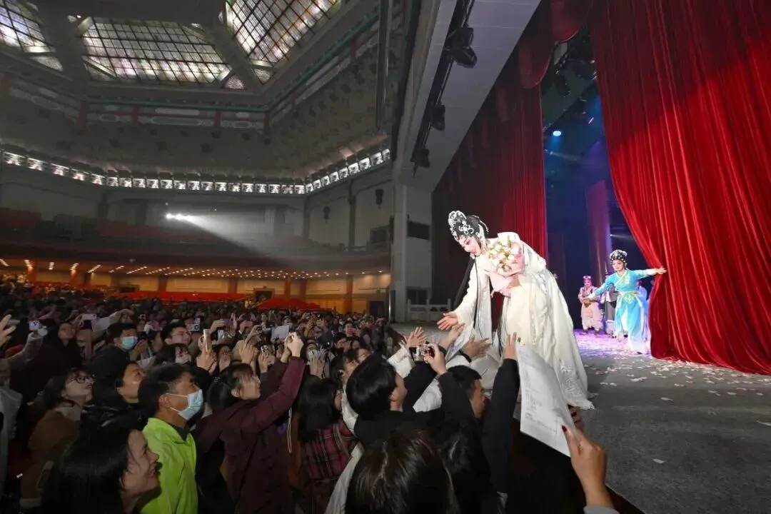 演出结束,掌声雷动,在场观众无一不为许白深情动容。花瓣落下,是属于《白蛇传·情》故事的暂时结束,也是属于每个观众的“情”之启程,尽管他们来自五湖四海,形色各异,心中却都牢牢地系挂着这份独属于粤剧的白蛇“情”。演出结束后,后台出口已被戏迷围得水泄不通。大家里三层外三层地守候着,翘首以盼,只为与心中的舞台偶像见上一面。一位戏迷分享:“2022年我入坑粤剧《白蛇传·情》,三年多来追演场场不落,几乎零缺席!今晚舞台完美100分,非常精彩,以后我还会继续支持《白蛇传·情》的每一场演出!”