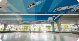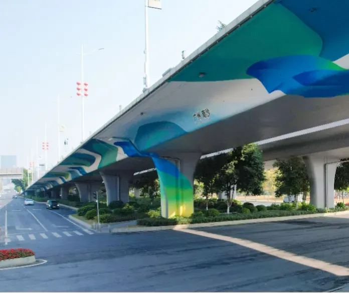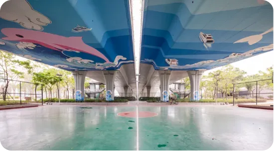 凤凰二桥桥下空间以“山—水—城—海”为叙事线索,通过天面、立面与柱体的整体创作,构建沉浸式生态画卷。篮球场、步道与彩绘共存,市民在运动、休憩中与艺术自然相遇。