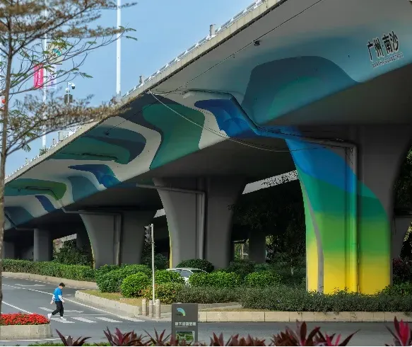 在南沙体育馆区域,艺术以“运动”为语言融入日常通行与休闲场景。凤凰一桥桥底与桥墩彩绘以芭蕉叶意象与运动曲线串联空间节奏,让通勤成为一段“行走的运动画面”。