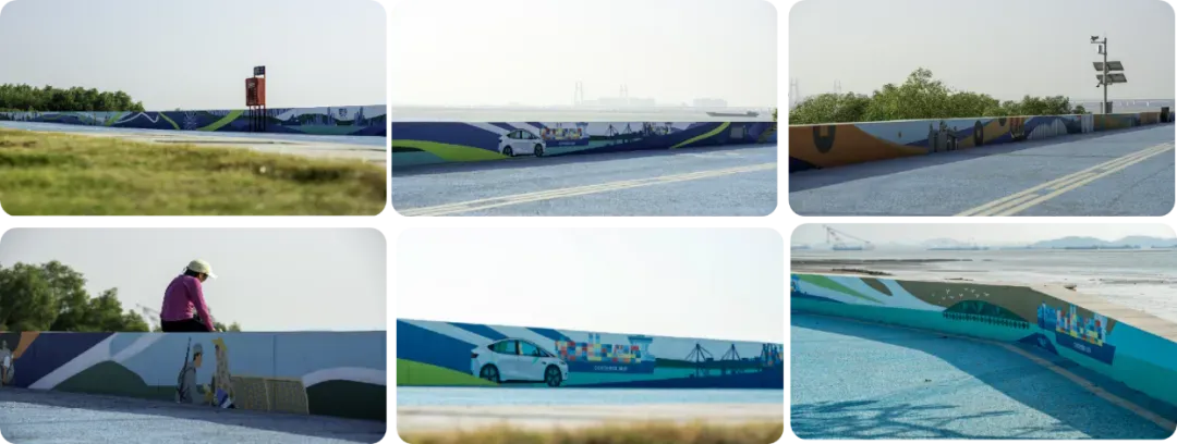 墙绘以“南沙海上丝绸之路文化脉络”为主题,用几何化、极简化的视觉语言,将四个历史阶段串联成一段随步伐展开的波浪式叙事。市民在散步、骑行中完成一次“行走式阅读”。