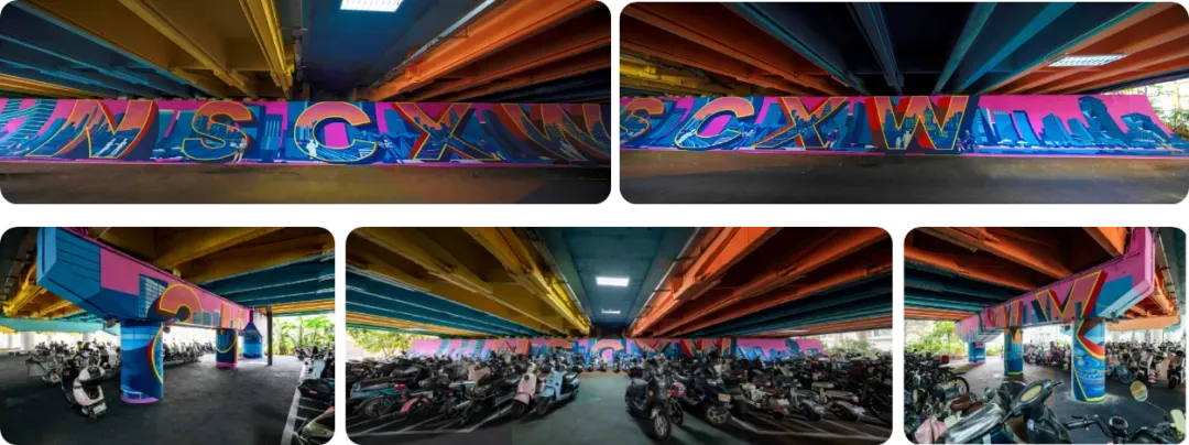 创享湾区域以高饱和度的未来视觉打造“城市中的城市”。超长涂鸦以“NSCXW”为核心图形,将广州、深圳、香港、澳门的城市景象嵌入字母之中,形成双重城市空间的叠合。