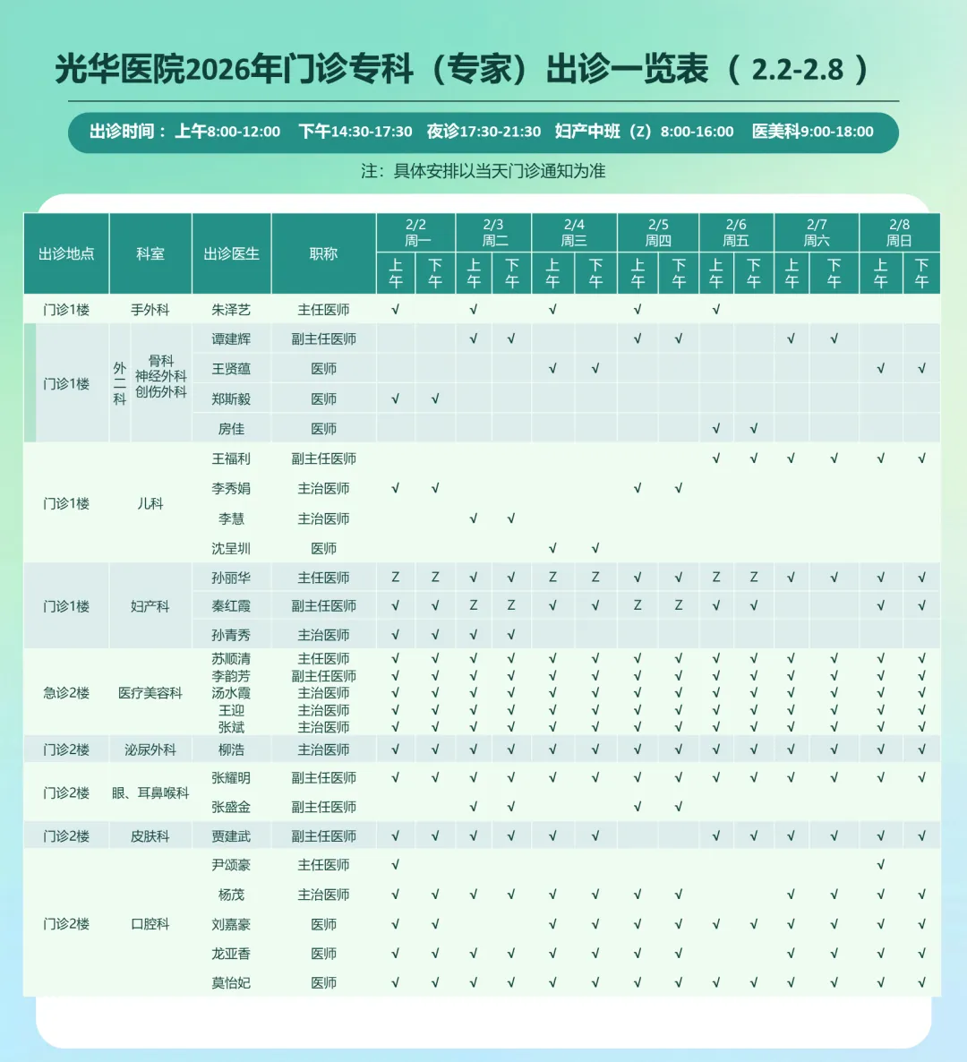 >东莞光华医院门诊专家出诊信息(2026年2月2日-2026年2月8日)