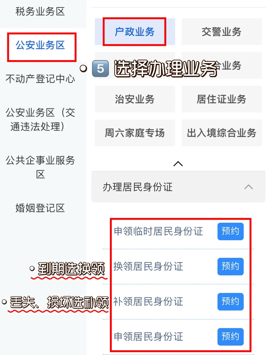 5.在公安业务区选择户政业务(根据自己实际办理情况选择办理居民身份证业务类型)