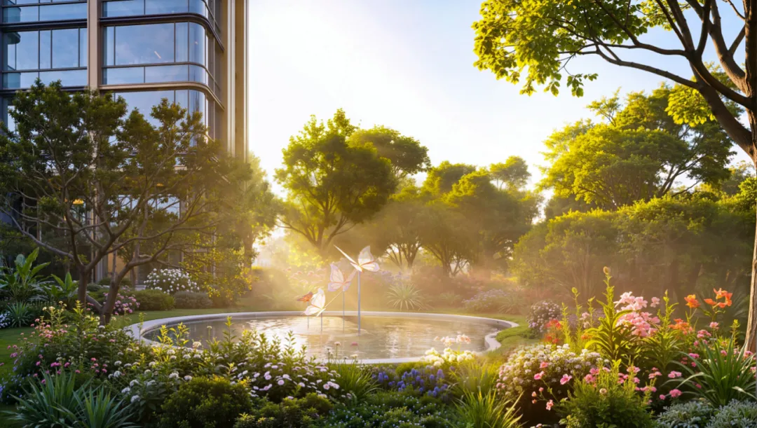 以法国莫奈花园为蓝本,搭配约250种珍稀花草,打造约2万方莫奈花园,以芬芳香草疗愈与雾森系统,实现微环境 调节与超五感自然疗愈。