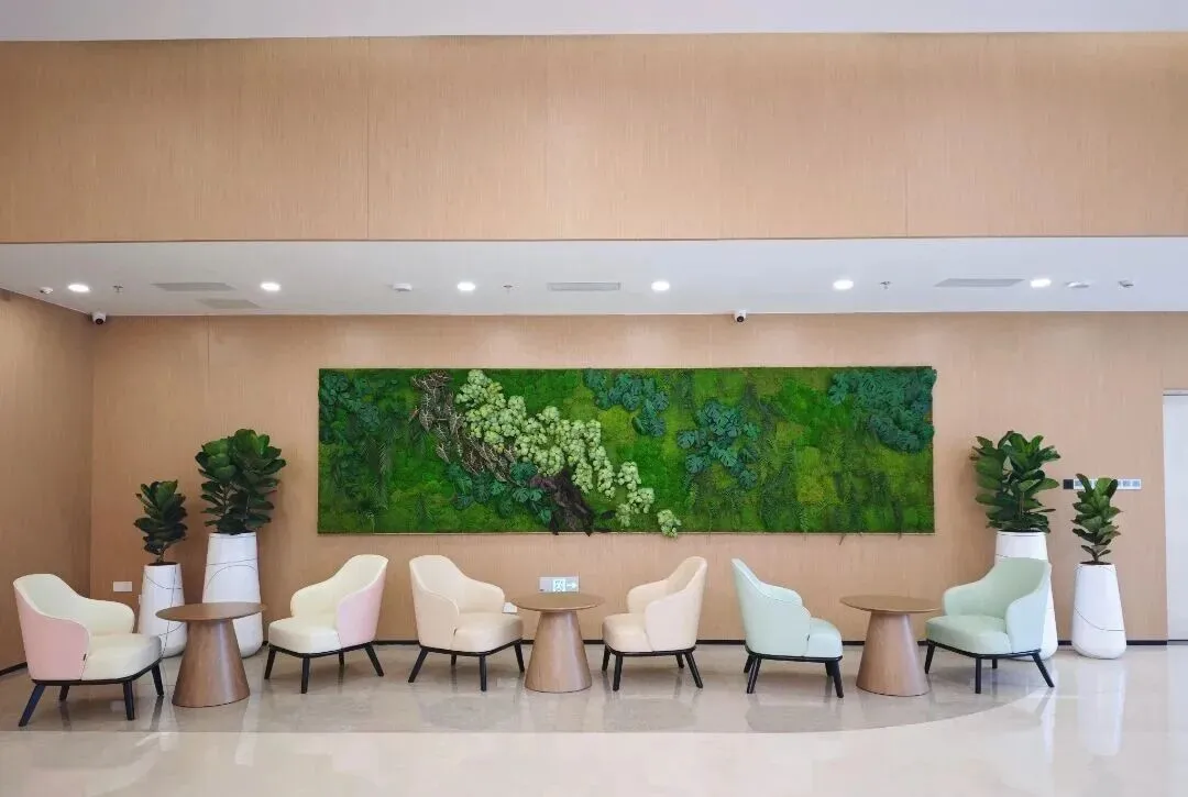 ●原木色的墙面、生机盎然的绿植墙,让候诊区成为放松身心的治愈空间