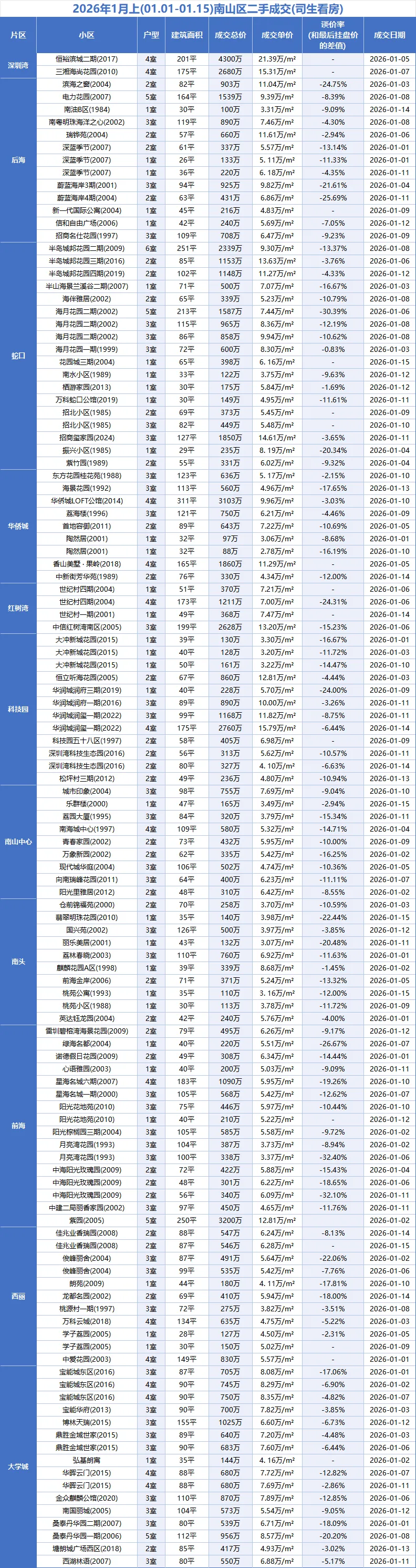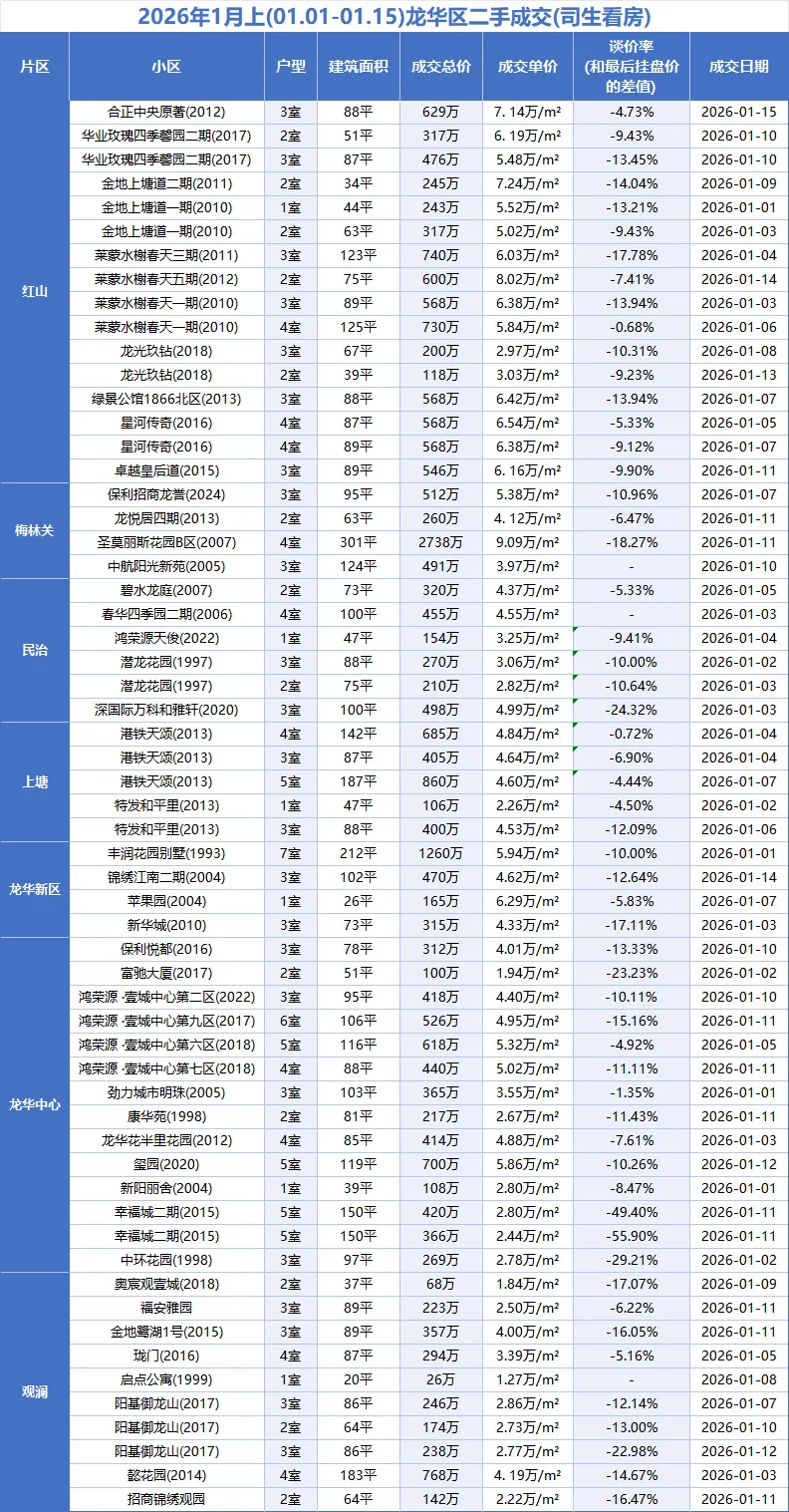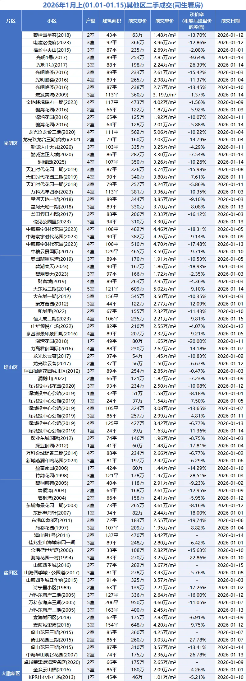 定期整理深圳二手房的成交数据,本次统计时间为:2026.01.01-01.15日,以下为深圳各大机构的数据,从挂盘价到实际成交价的浮动率,应该也相当有参考价值了。