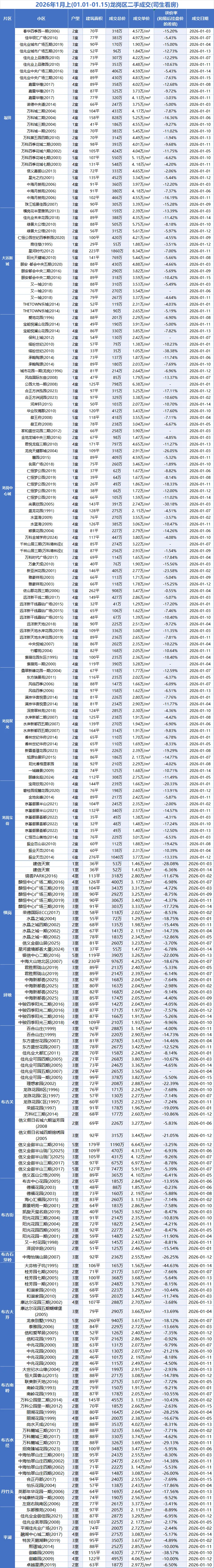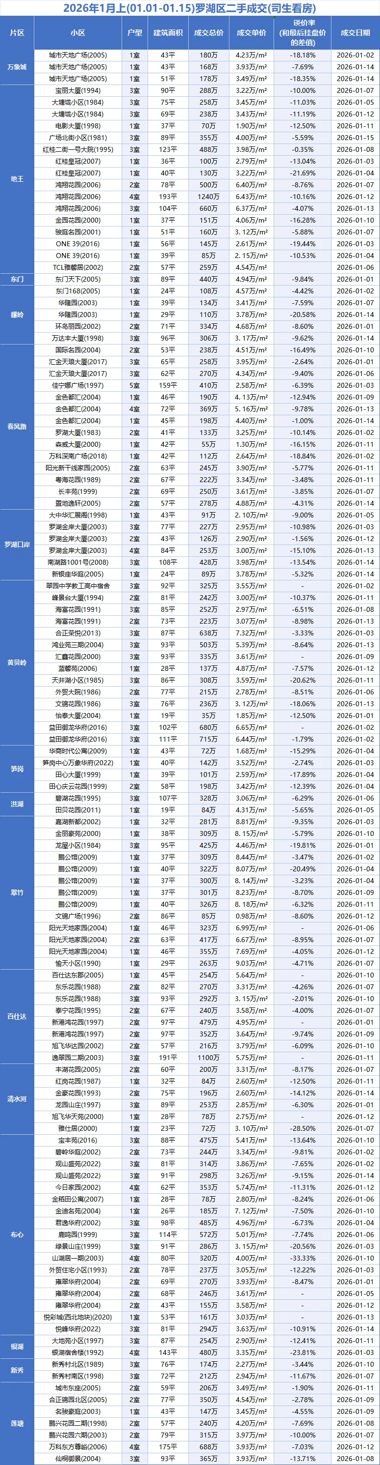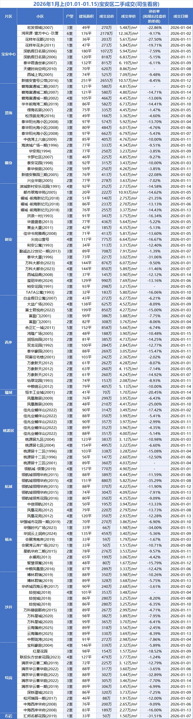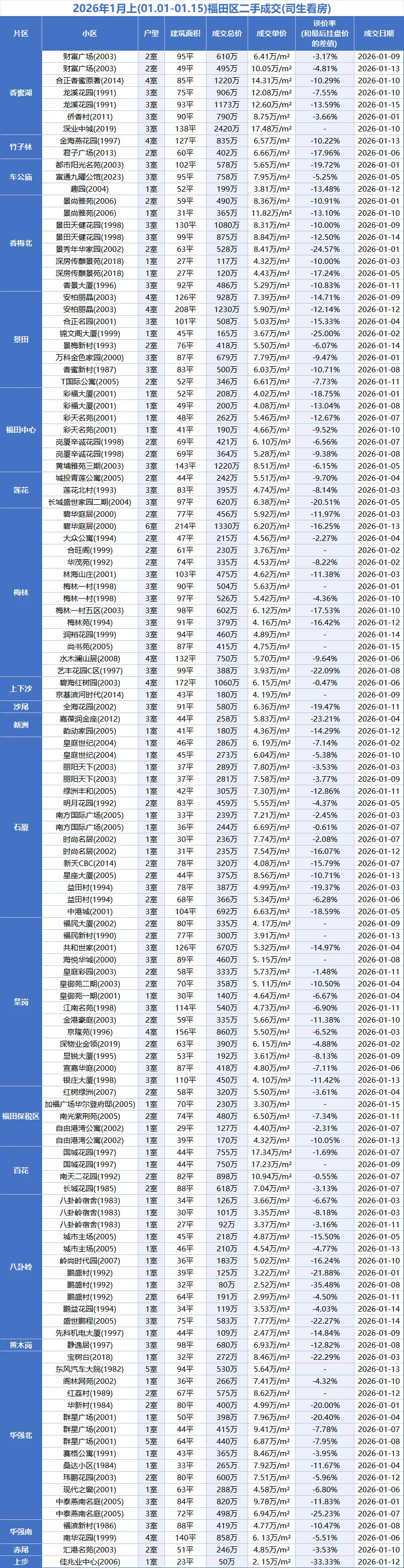 定期整理深圳二手房的成交数据,本次统计时间为:2026.01.01-01.15日,以下为深圳各大机构的数据,从挂盘价到实际成交价的浮动率,应该也相当有参考价值了。