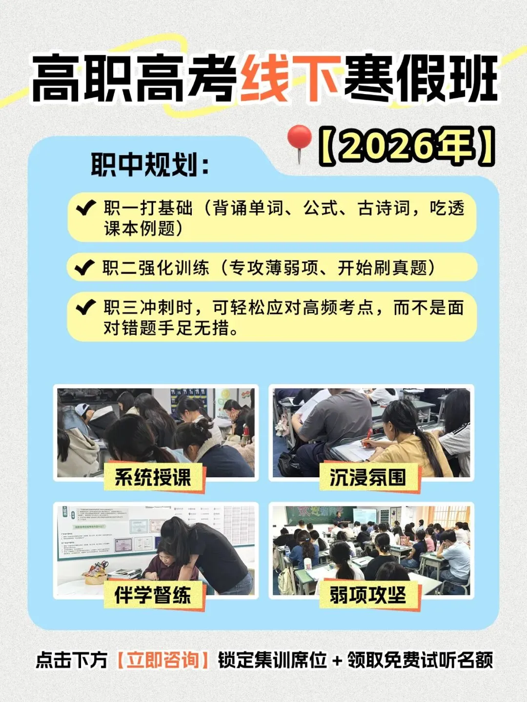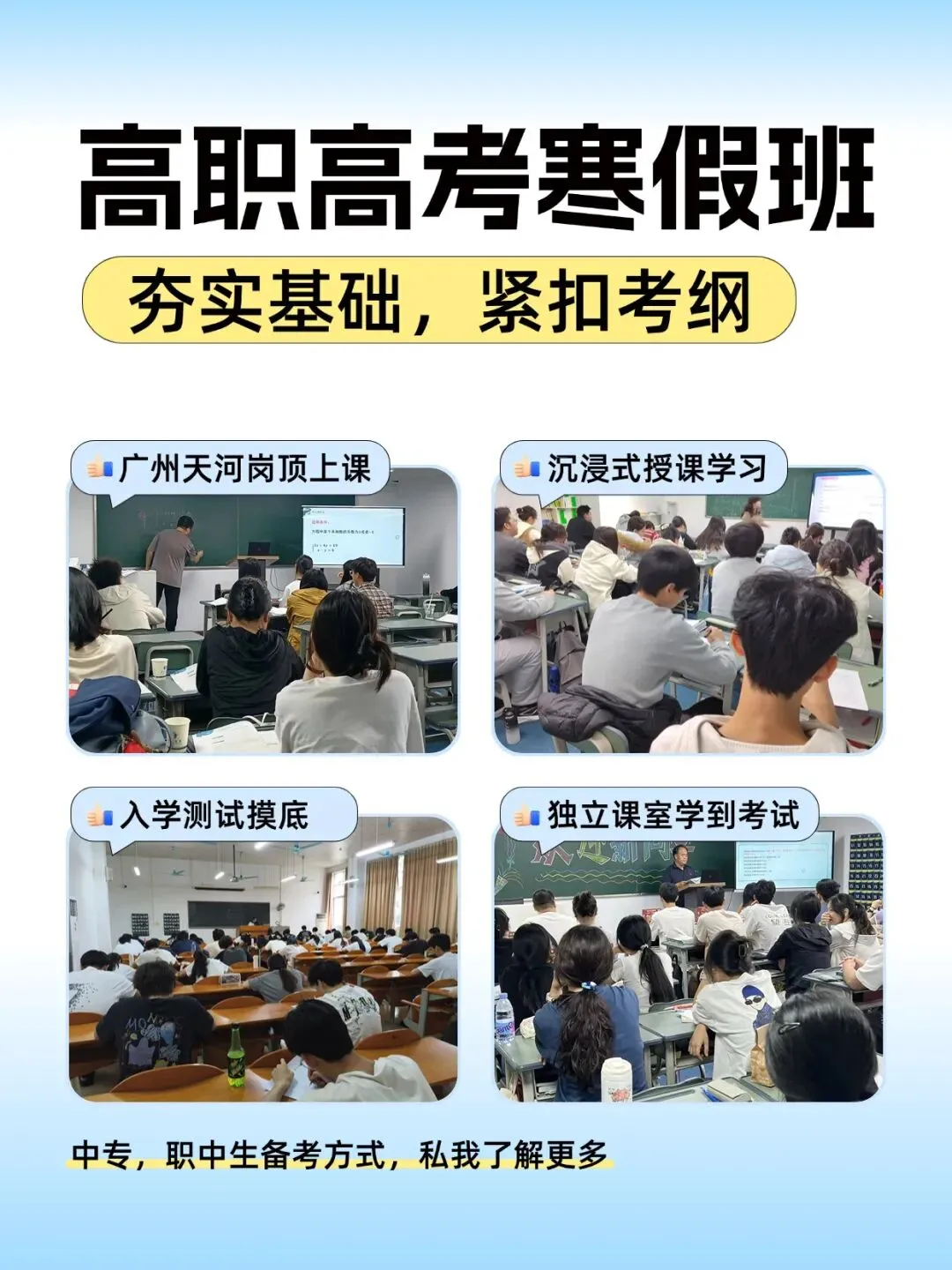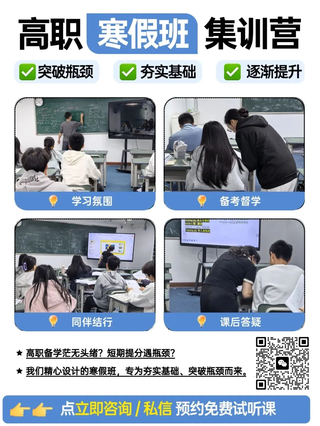 高职备学茫无头绪?短期提分遇瓶颈?这个寒假,正是你扭转局面的关键!我们精心设计的寒假班,专为夯实基础、突破瓶颈而来。课程直击考点,帮助你有目标、有节奏地系统复习,找回学习主动权。现在报名更享立减优惠,名额有限,别再犹豫,用这个假期为你的高职高考赢得先机!近地铁口,广州天河教学点