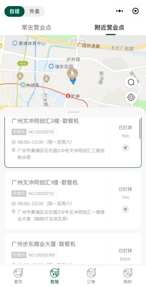沙拉食刻广州区域79个取餐机点位,均显示为打烊状态。沙拉食刻小程序截图