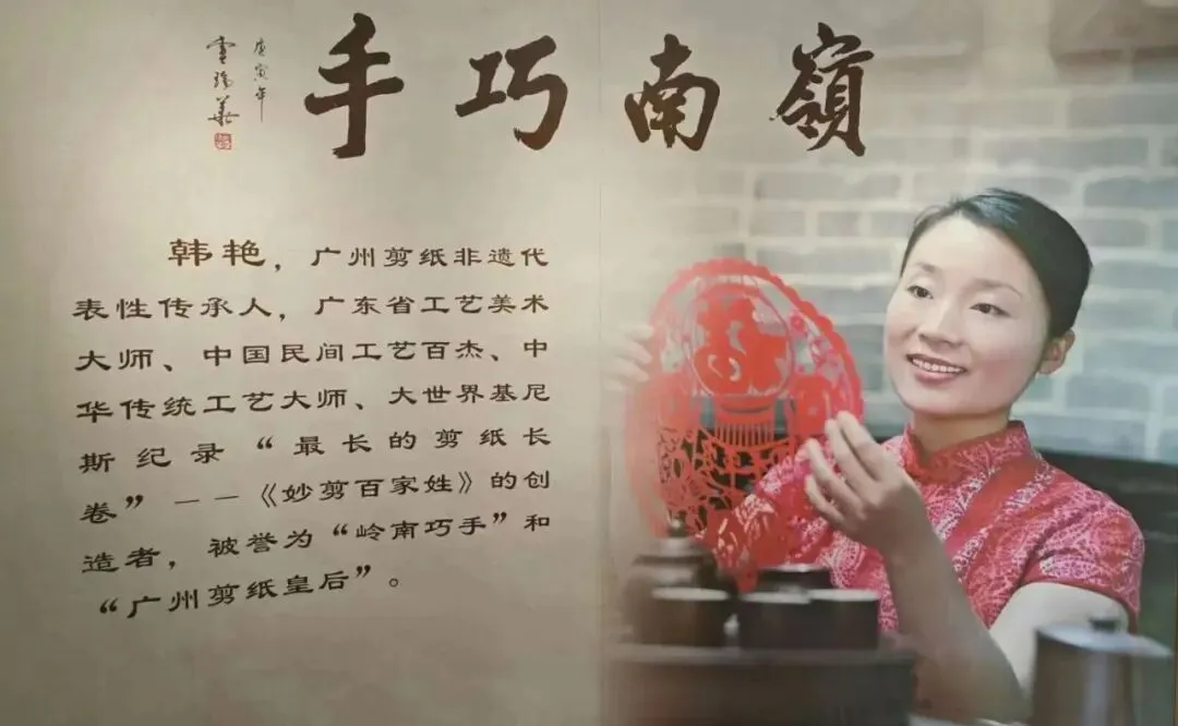 韩艳长期从事剪纸创作与非遗传承,代表作《团圆》《母亲》《赏灯》获第二届国际剪纸艺术展铜奖等10余项国际国家级奖项 。2021年创建全国首间剪纸数字艺术馆,运用VR/AR技术展示剪纸作品。2023年向海珠区民族团结进步协会捐赠《红棉盛开心向党》和《民族团结庆百年》等主题作品 。2024年11月举办“妙剪生花传非遗”个展,展出《抗疫天使护平安》等作品,并向院校捐赠《广州剪纸非遗史》书籍 。其作品被塞舌尔共和国政府、中国妇女儿童博物馆等机构收藏 ,2024年11月入选羊城工匠培育对象 。