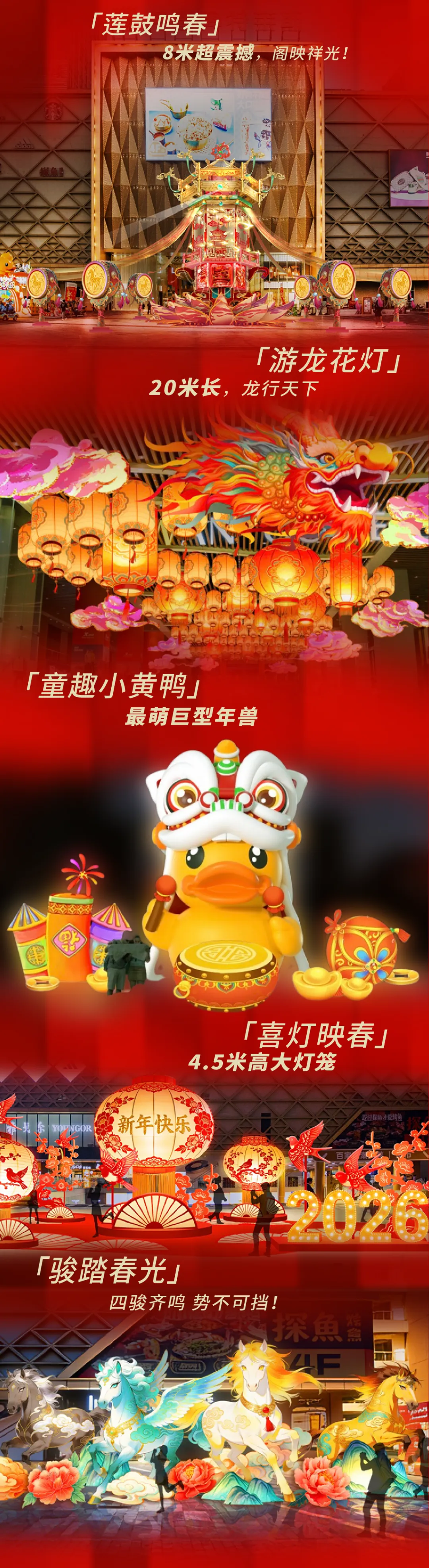 这场横跨春节、元宵节的民俗文旅盛宴从1月31日启动,持续至3月3日,为期32天,以11组巨型花灯为核心,串联龙湾奥特莱斯、华南MALL两大商圈,融合非遗民俗与潮流玩法、叠加重磅消费福利,为市民游客打造沉浸式新春体验,彰显万江“水乡年味担当”的独特魅力。