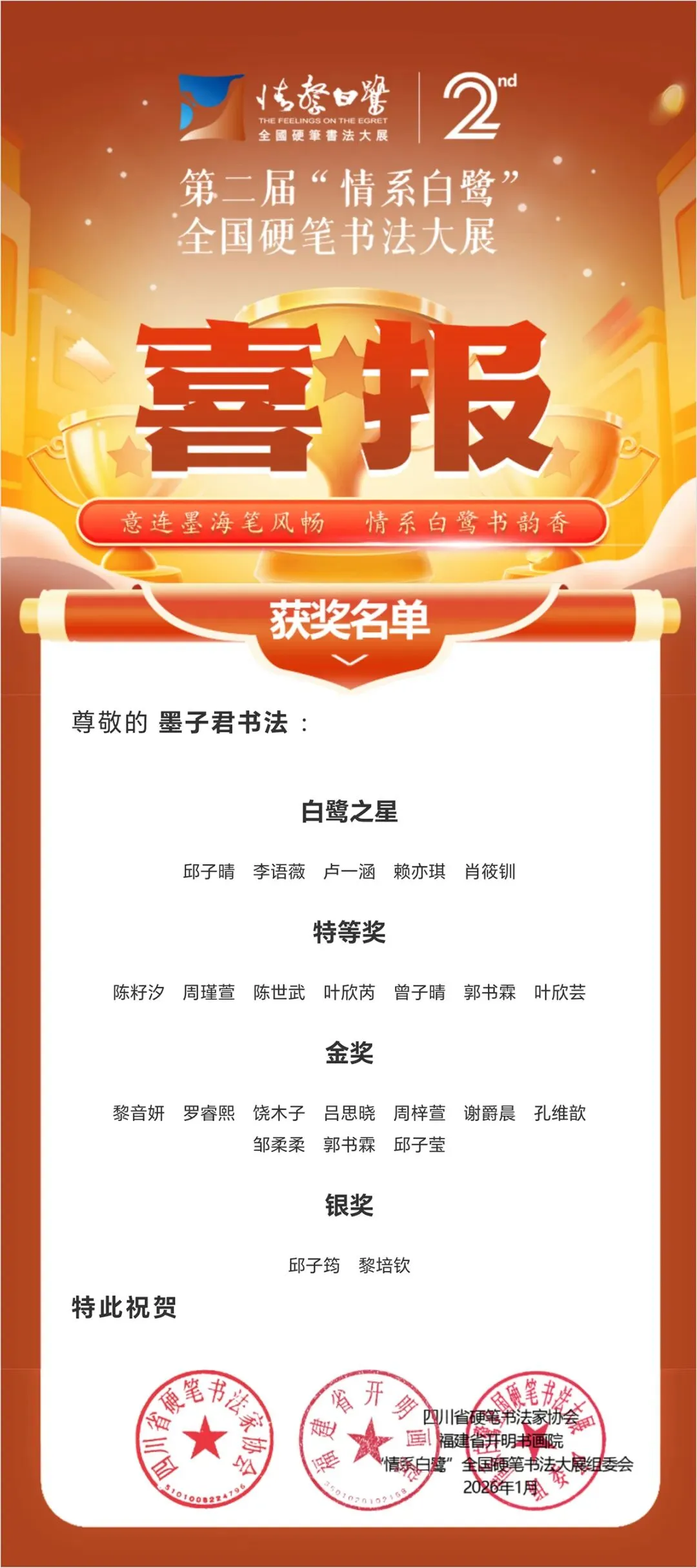 东莞墨子君书法 | 第二届情系白鹭| 全国硬笔书法大赛 | 学员获奖情况(作品展示)