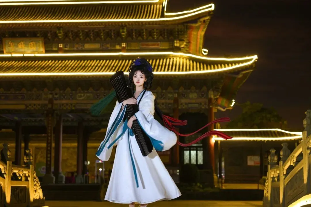 傍晚灯笼亮起,亭台楼阁映着璀璨灯火,晚风轻拂,氛围感拉满,