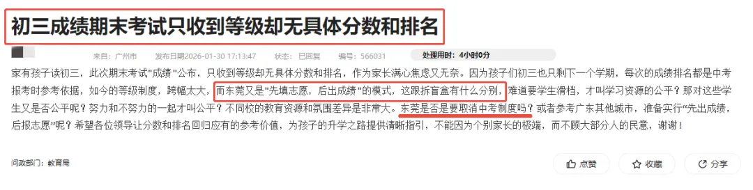 一名初三学生家长表示,每次的成绩排名都是中考报考时参考依据,东莞又是"先填志愿,后出成绩"的模式,这跟拆盲盒有什么分别,难道要学生滑档,才叫学习资源的公平?