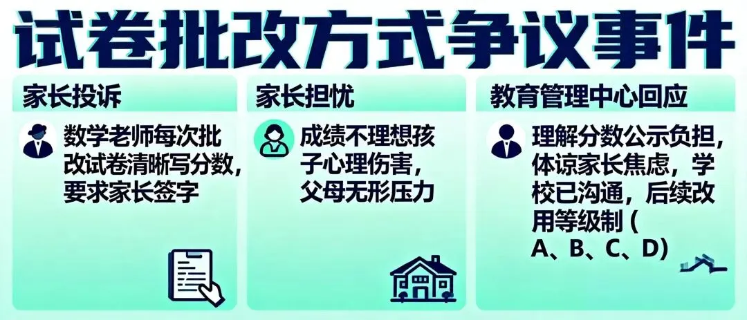 虎门镇教育管理中心很快回应:理解分数公示可能给部分学生带来负担,也体谅家长的焦虑。学校已与老师沟通,后续将改用等级制(如A、B、C、D)代替具体分数。